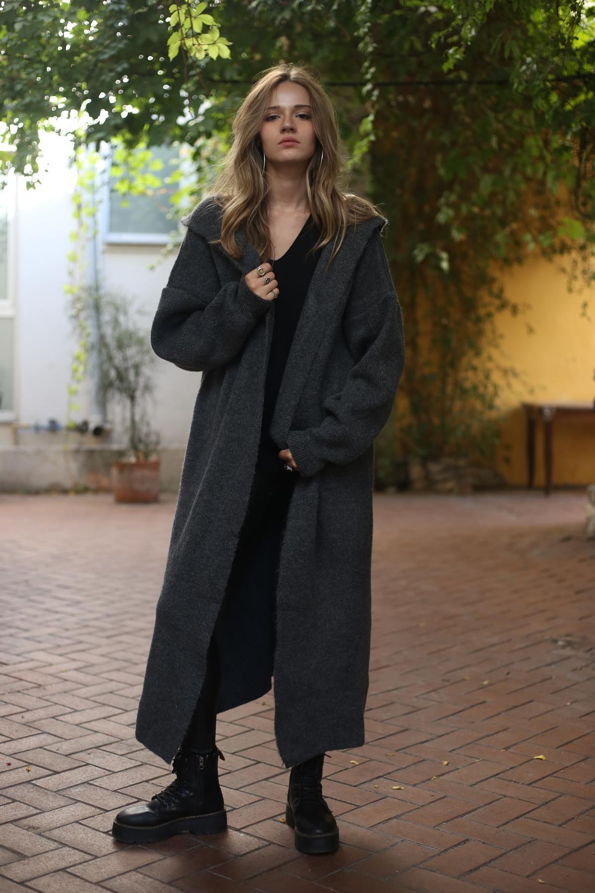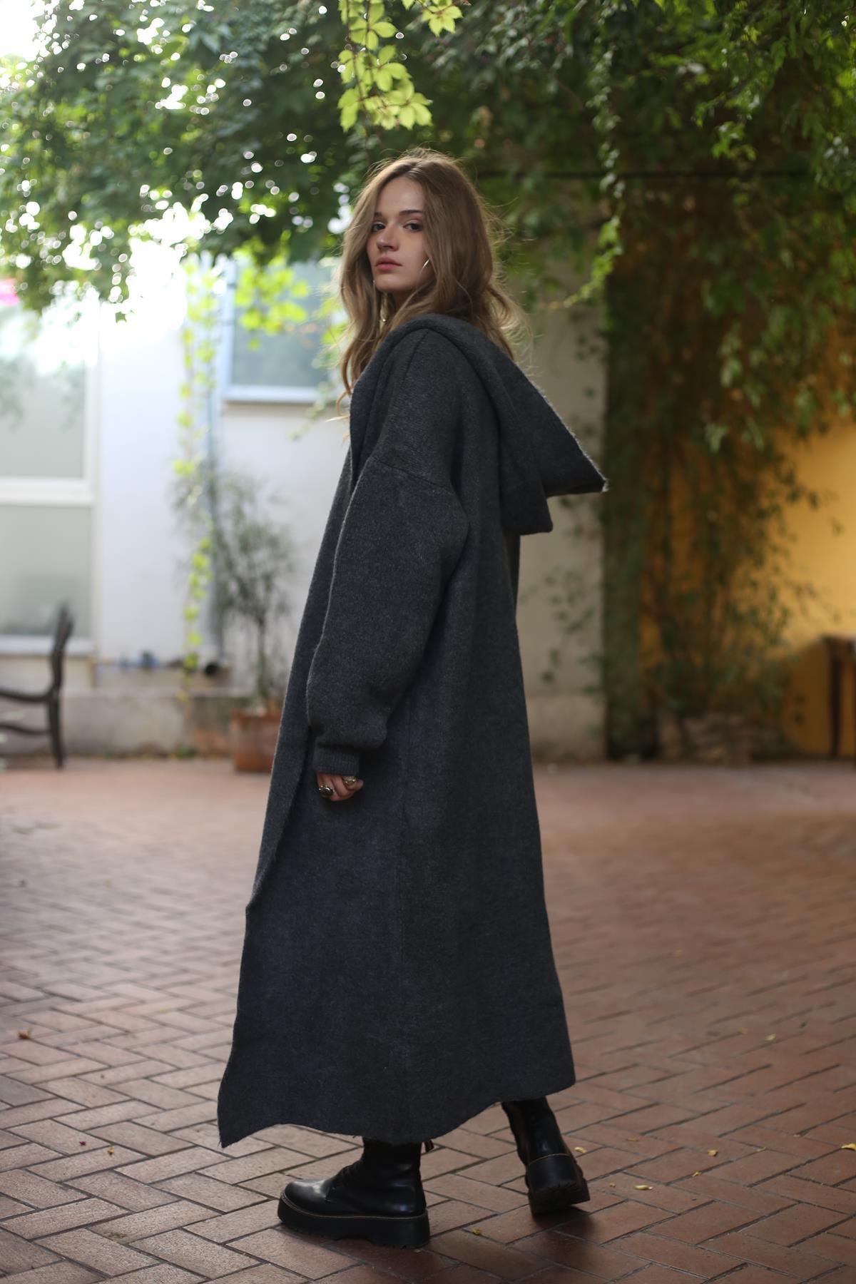 Antrasit Kapüşonlu Uzun Triko Hırka