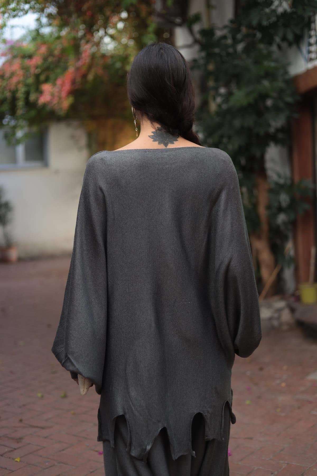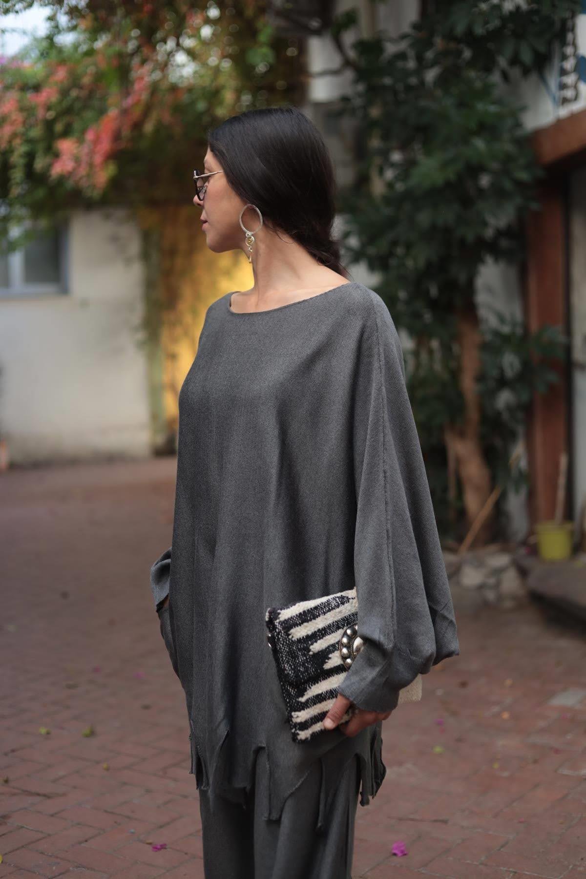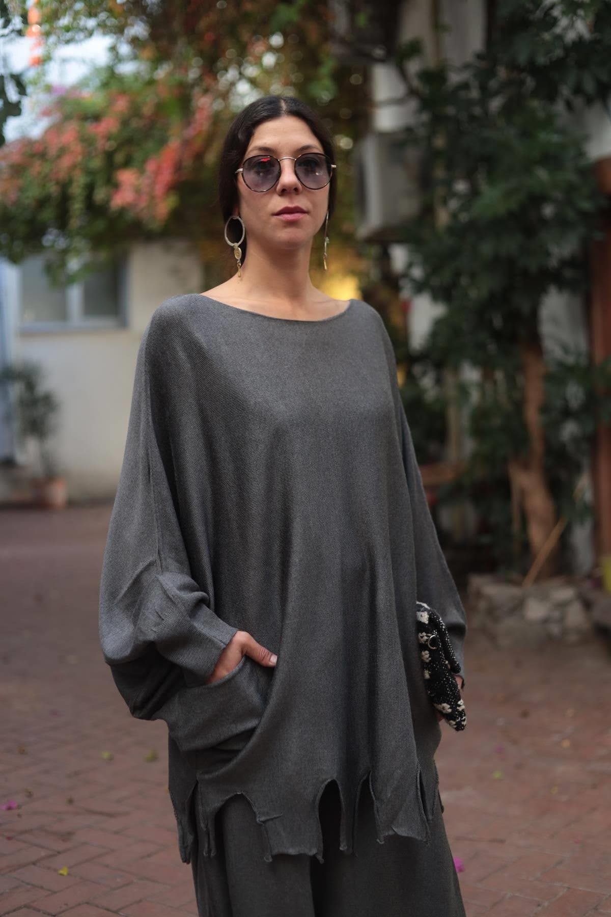 Antrasit Püsküllü Triko Tunik