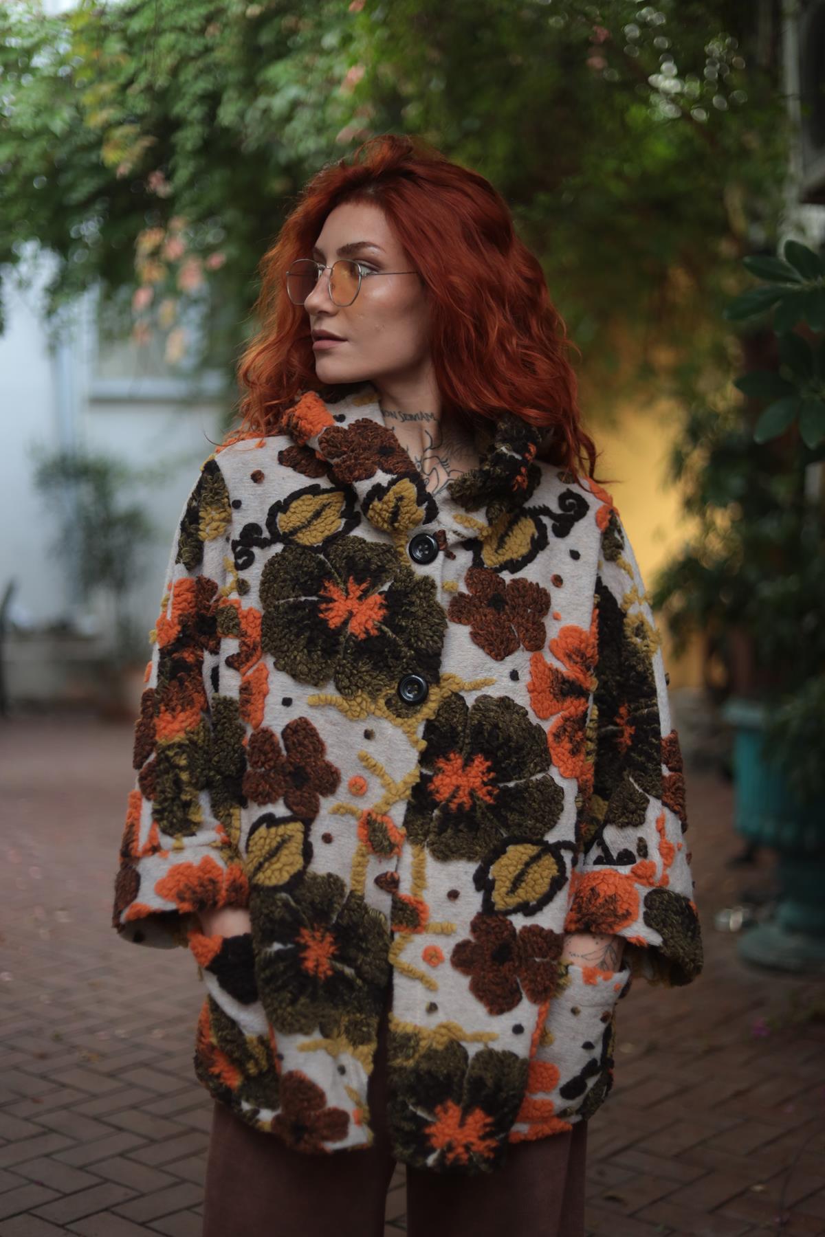 Bej Çiçek Desenli Cepli Kısa Keçe Kaban