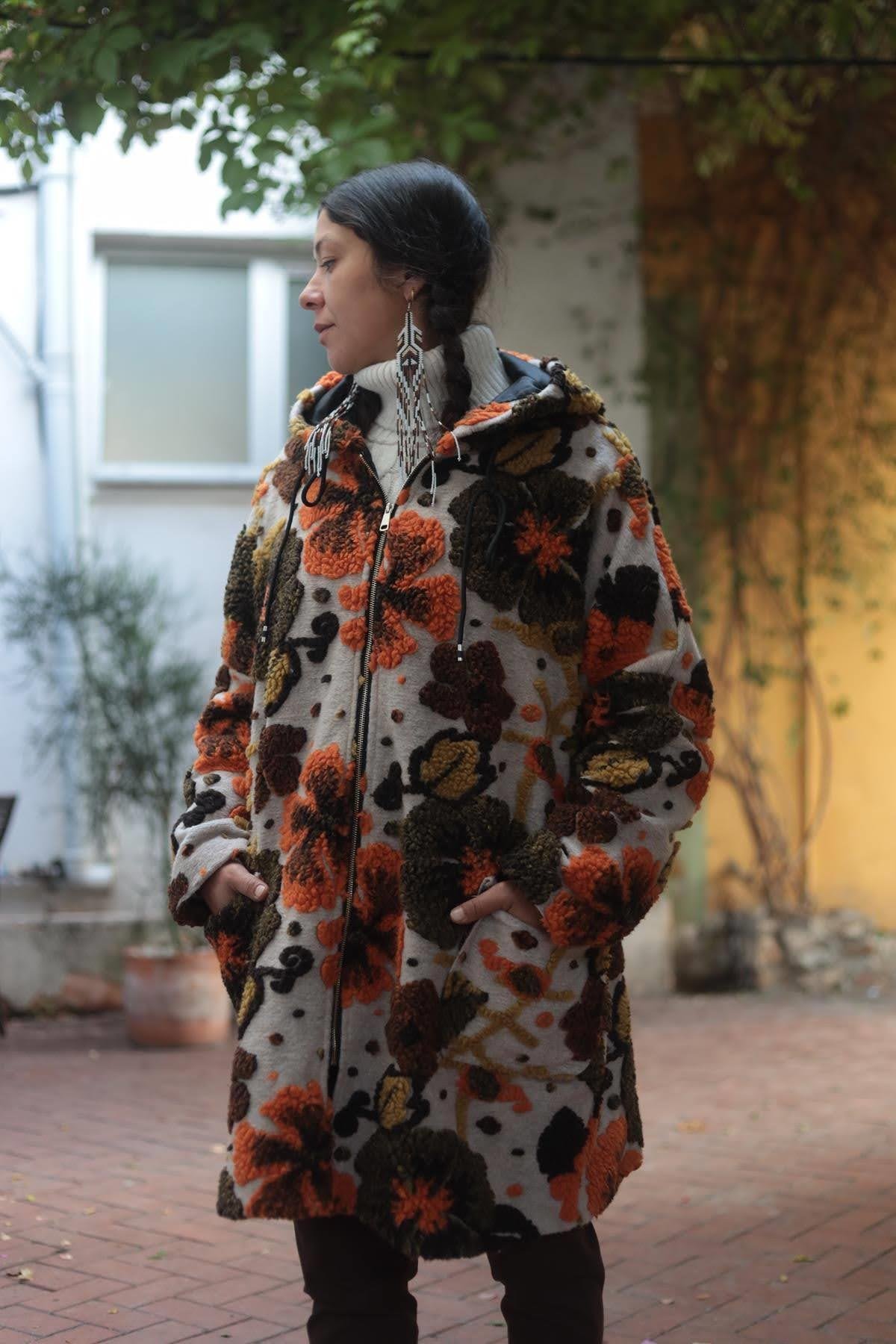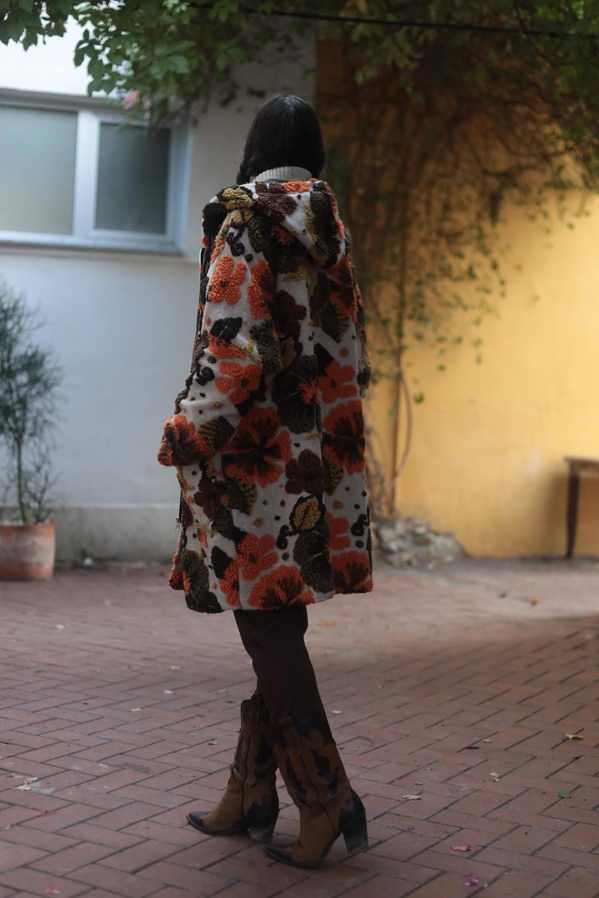 Bej Çiçek Desenli İpli Kapüşonlu Keçe Kaban