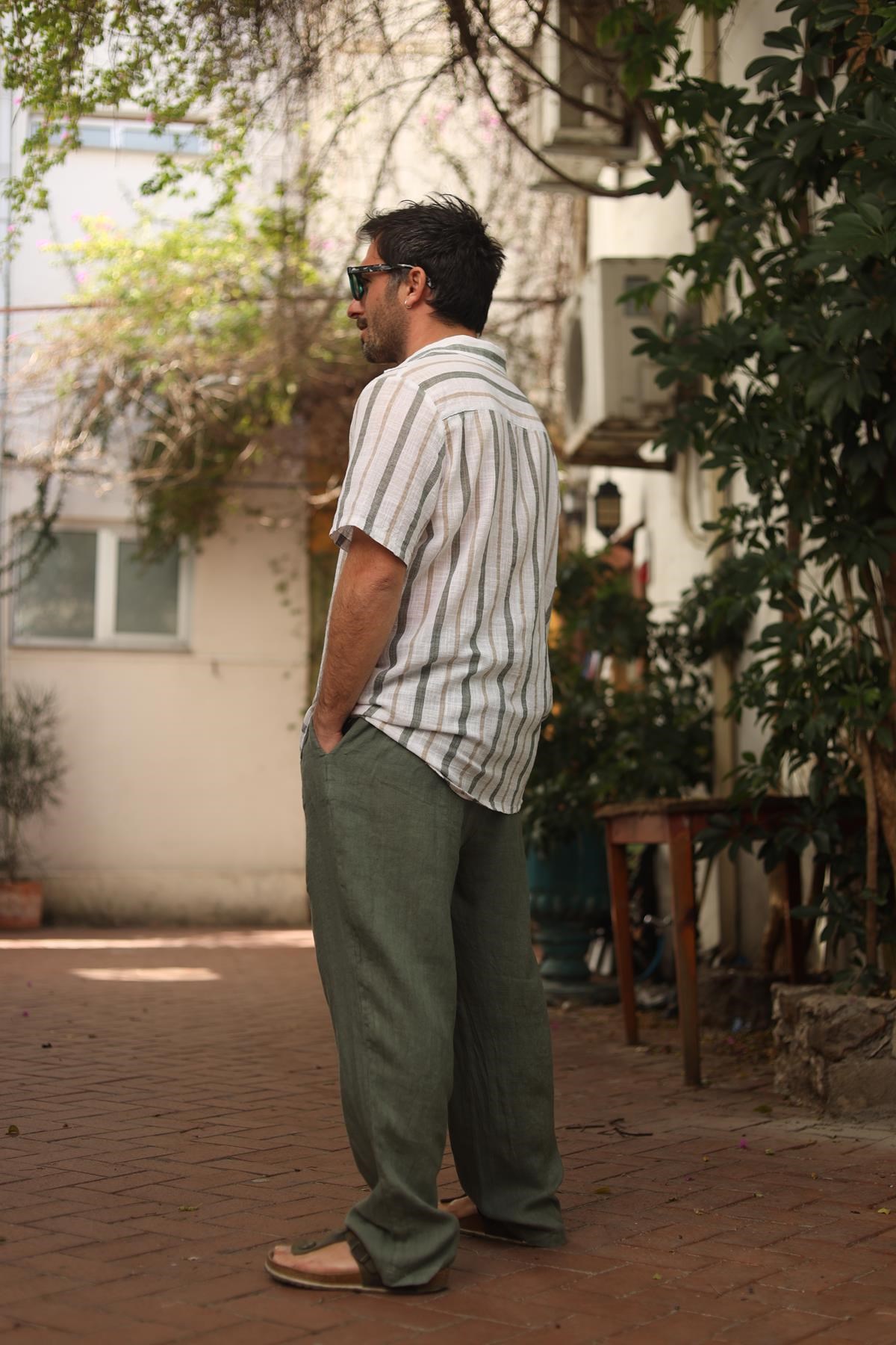Beyaz Çizgili Kısa Kollu Erkek Keten Gömlek