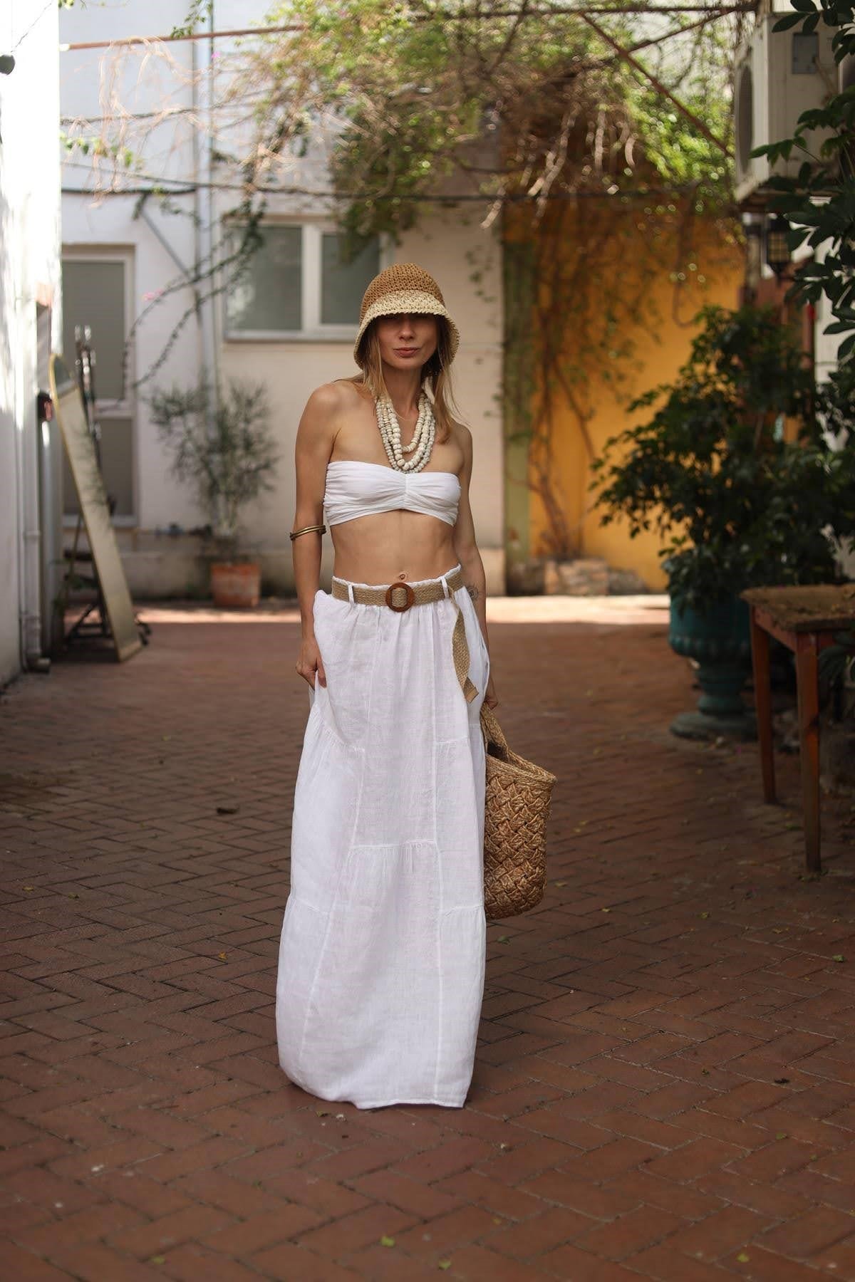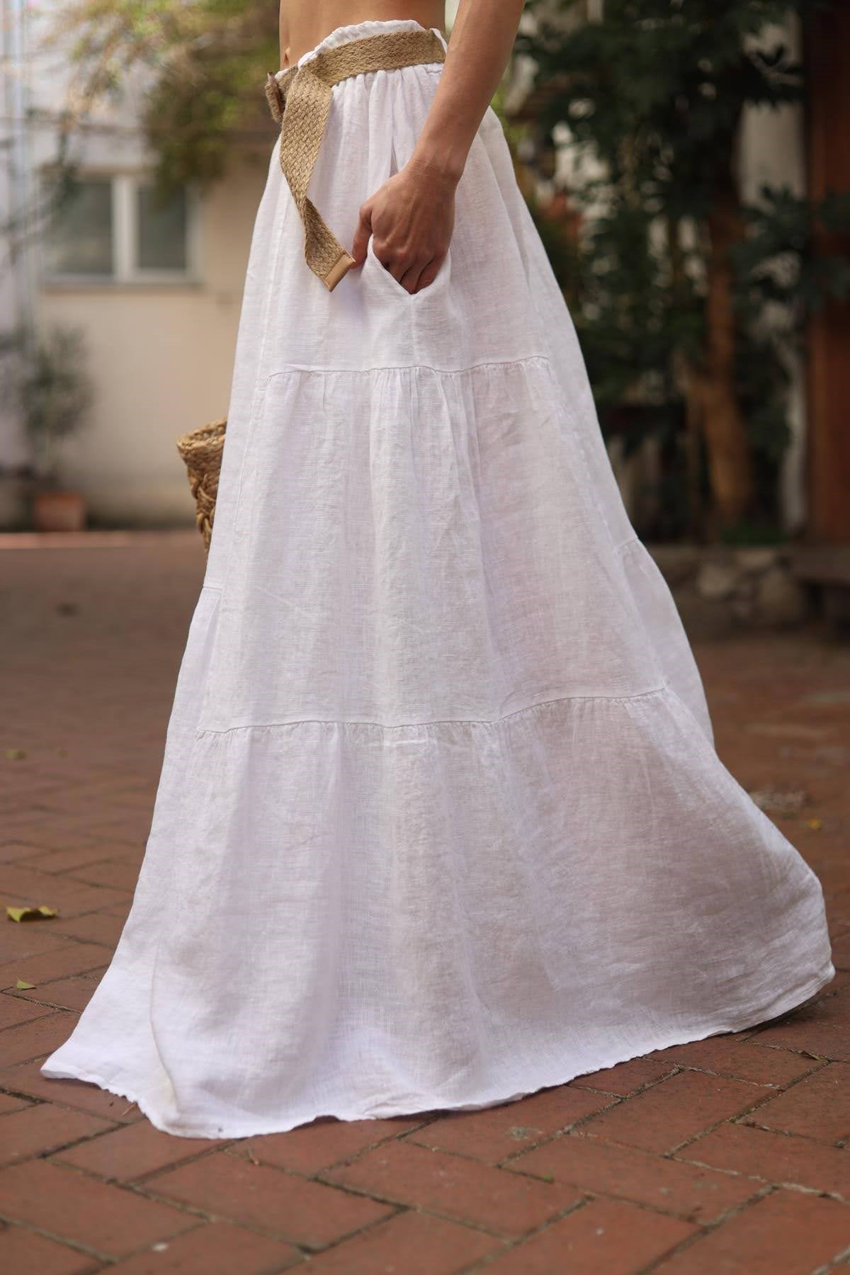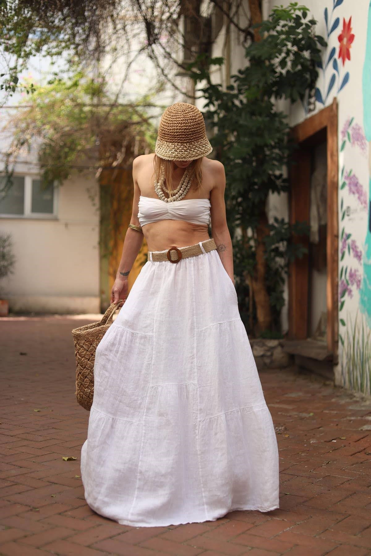 Beyaz Dikiş Detaylı Keten Etek (KET-AS-020-KTN-BE-STD)