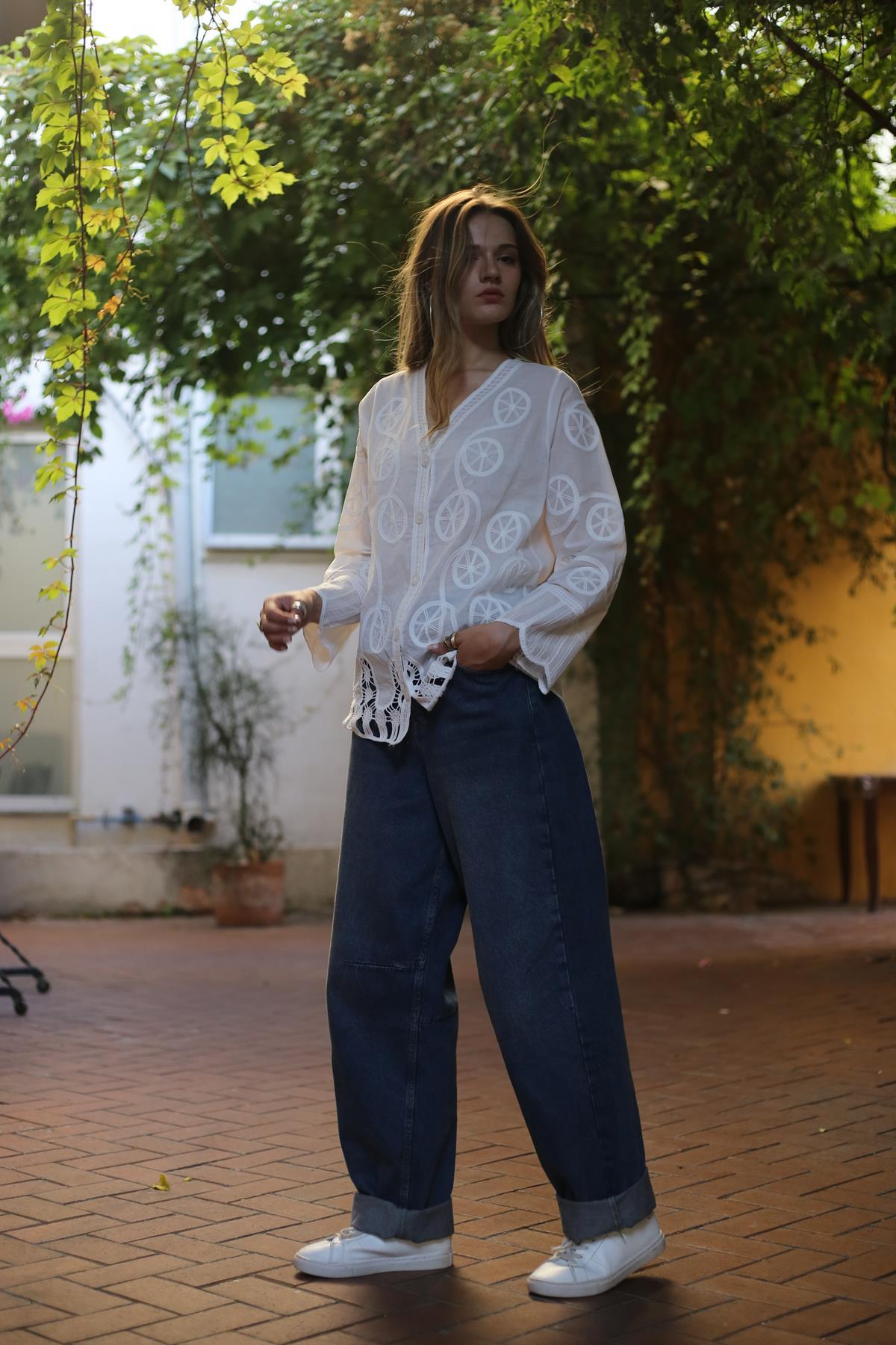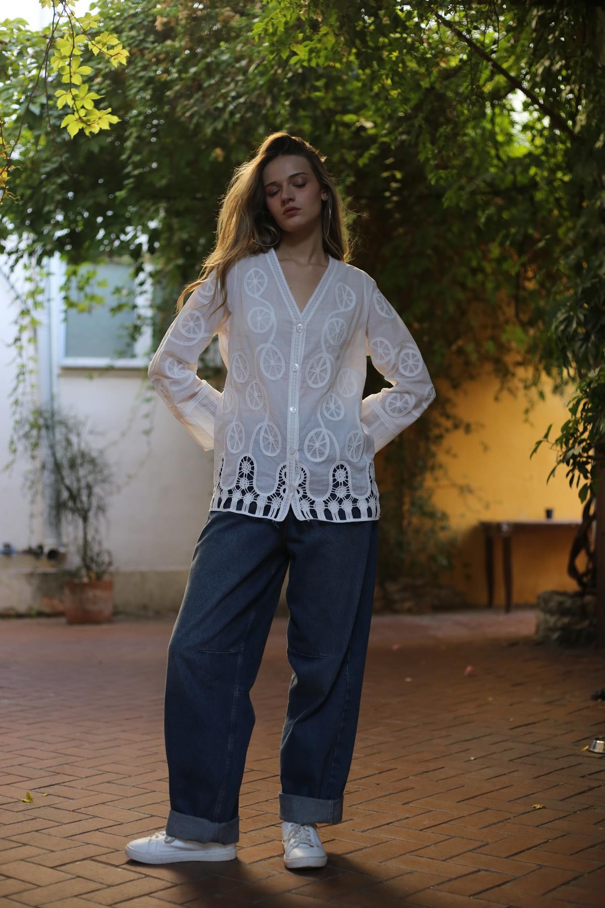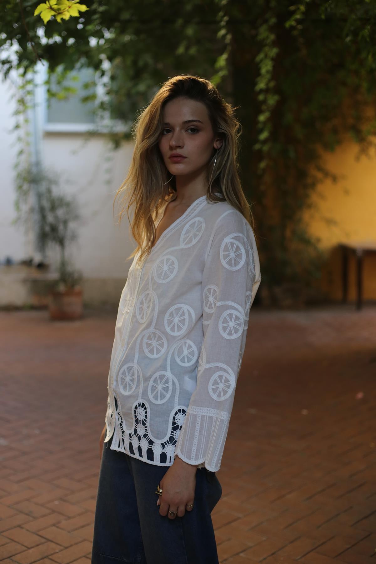 Beyaz Otantik Nakışlı Ajurlu Gömlek