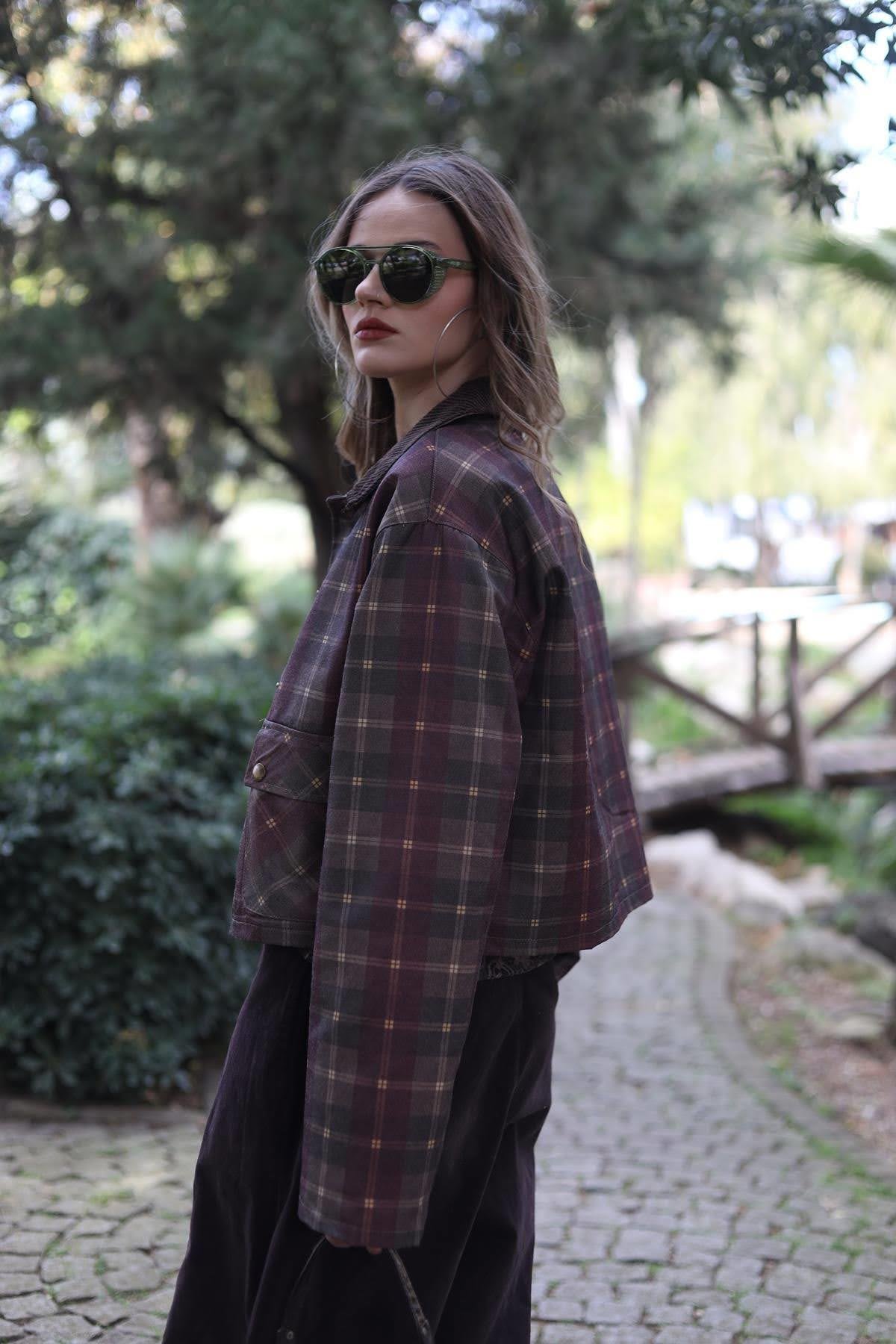 Bordo İçi Polar Yakası Kadife Kısa Ekose Mont (KMNT-CR-003-PO-BO-S)