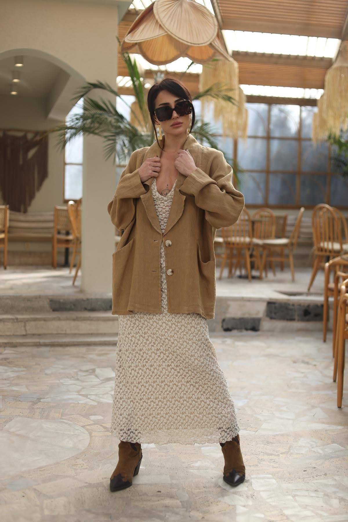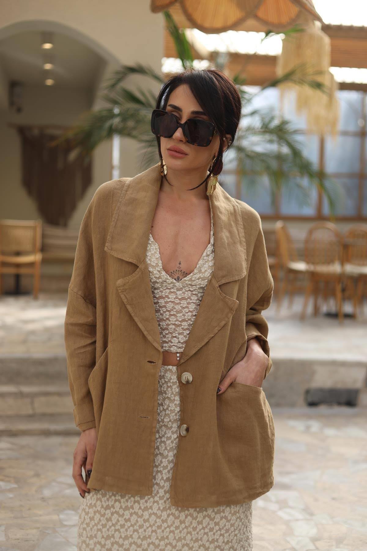 Camel Rengi Blazer Yaka Keten Ceket