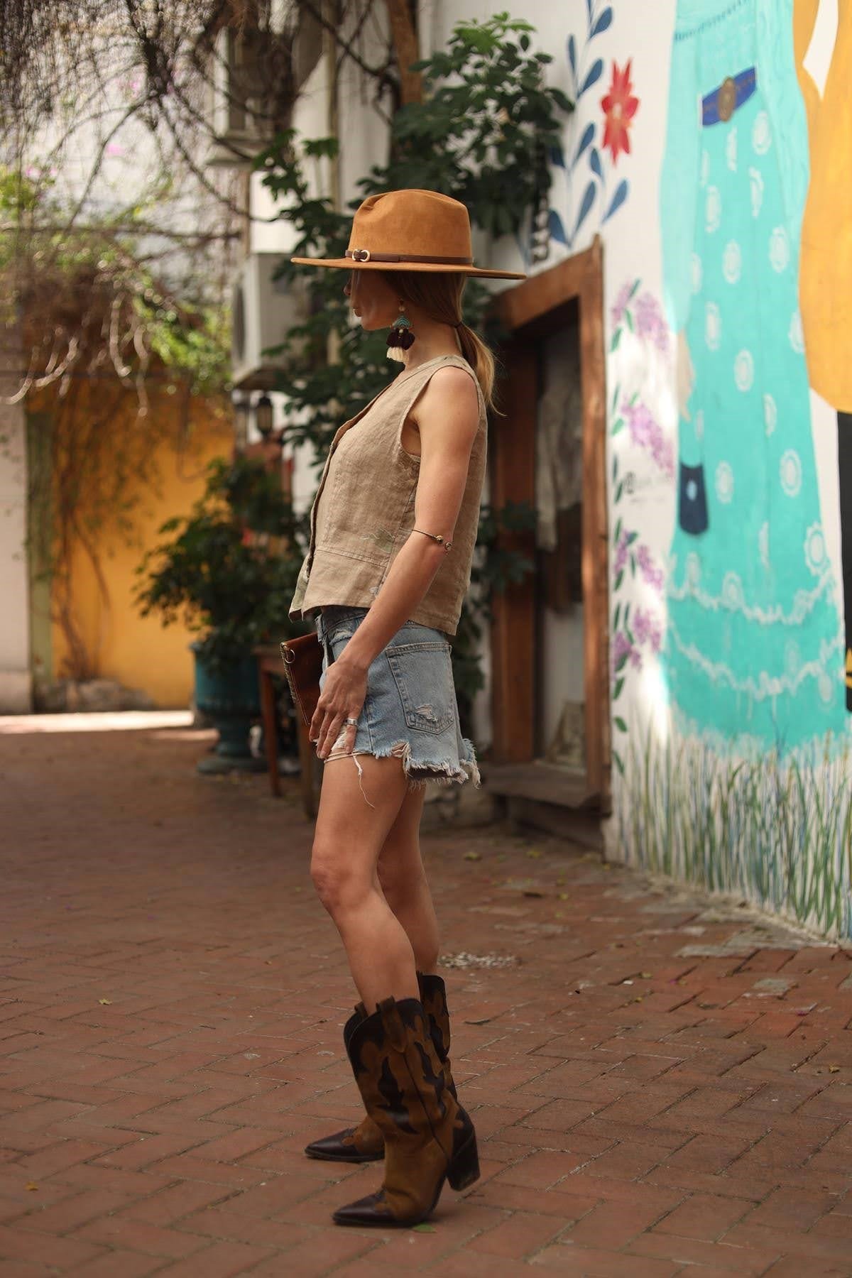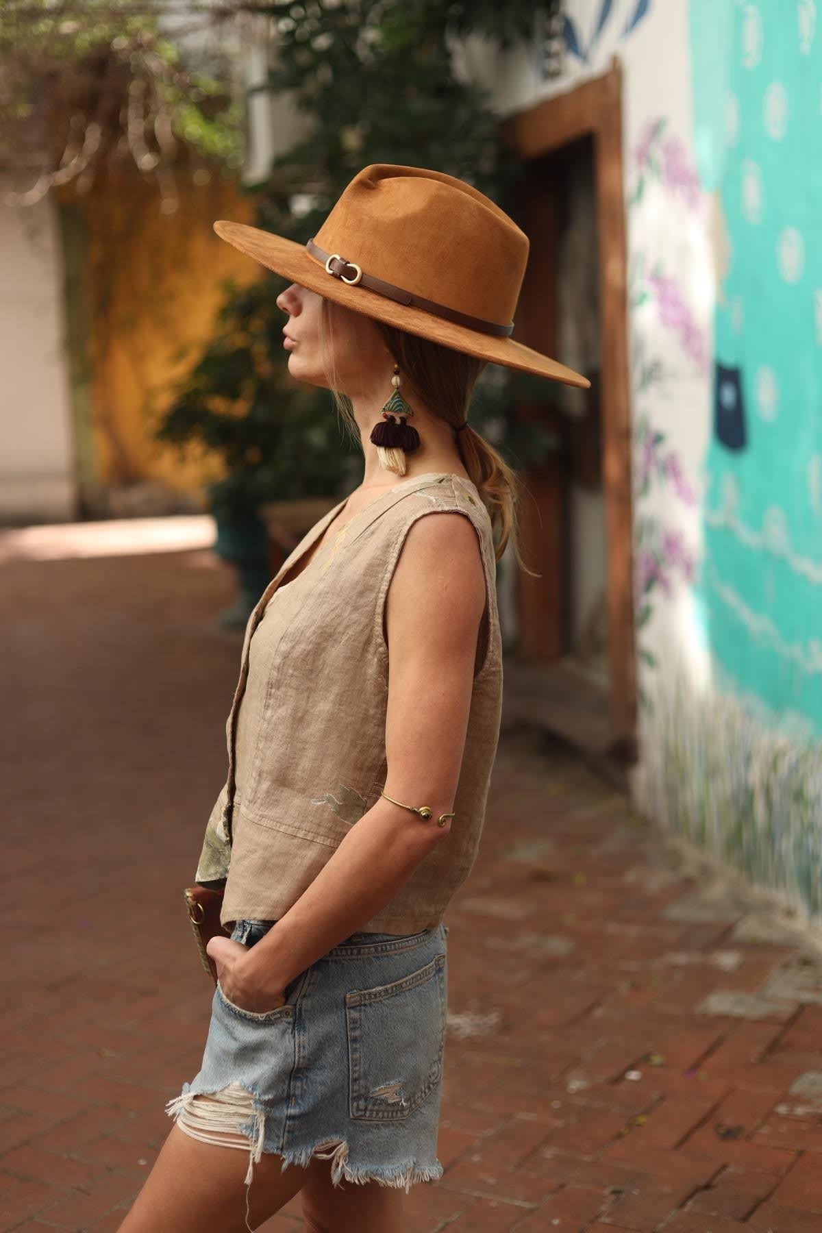 Camel Rengi Çiçek Desenli Düğmeli Keten Bluz (KB-SIT-039-KTN-CA-STD)