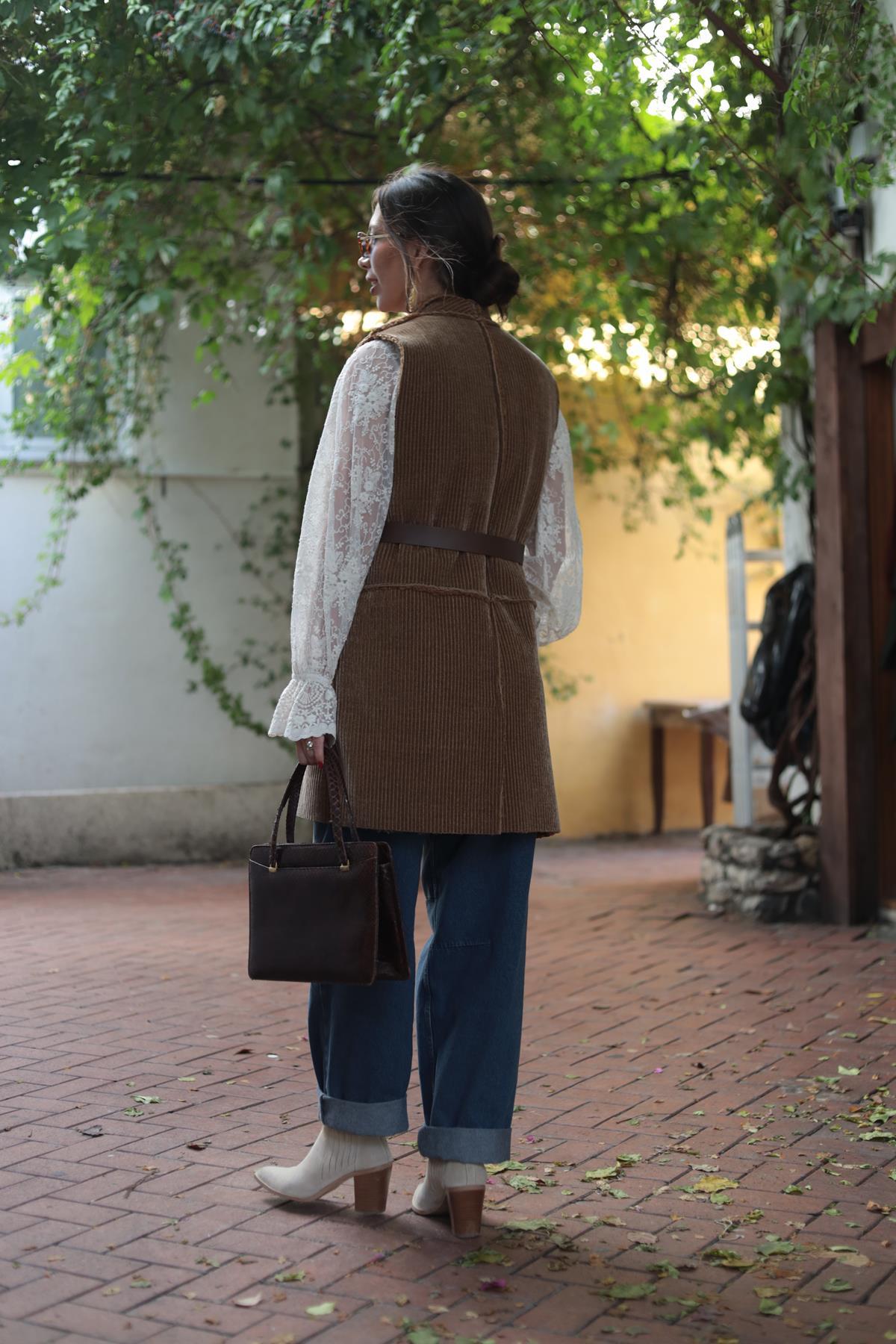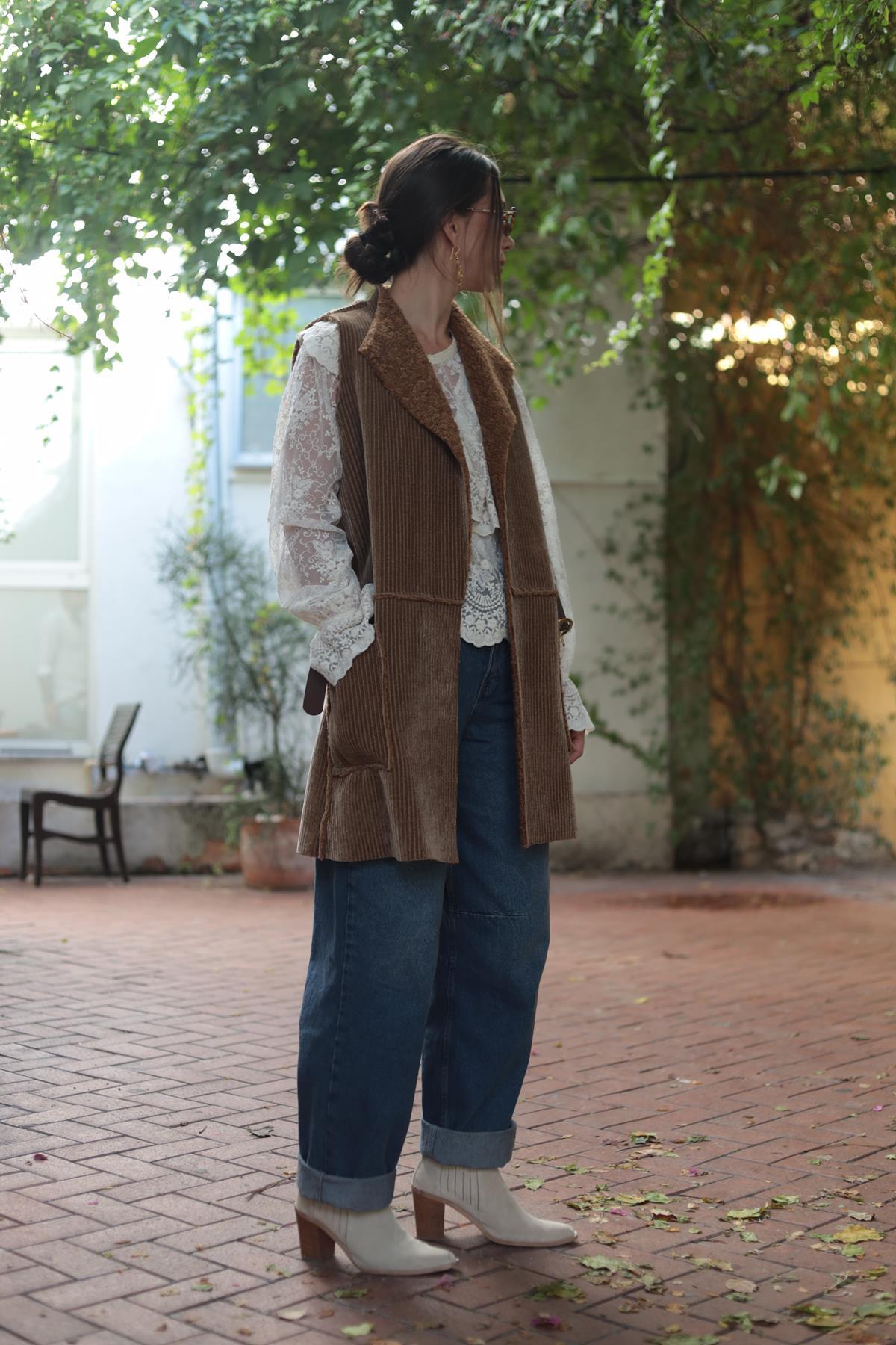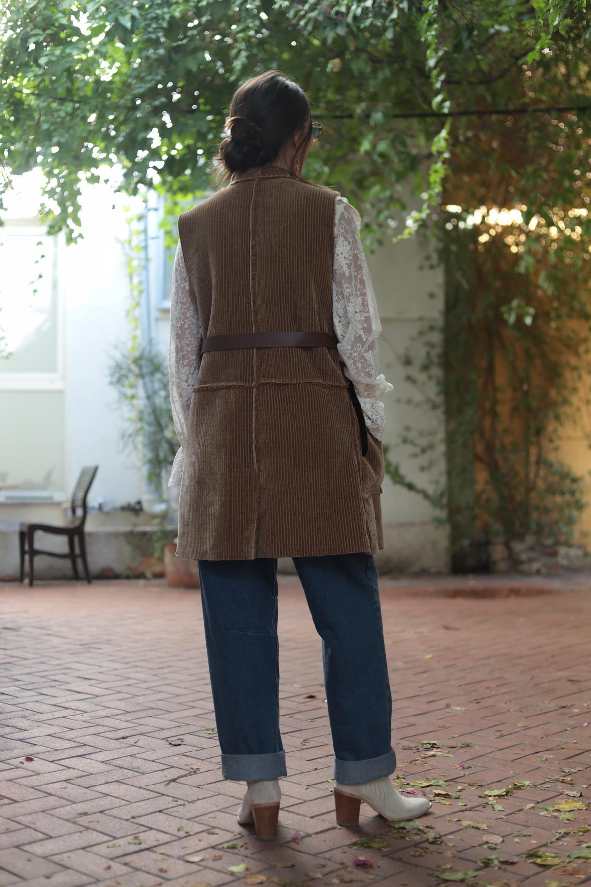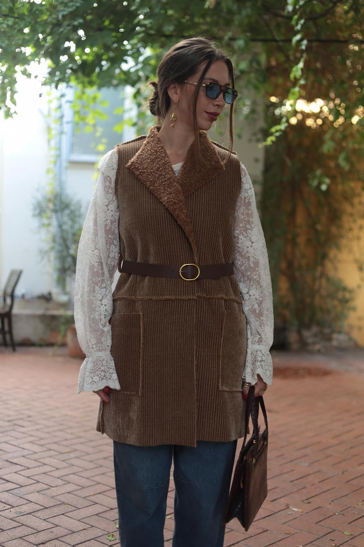 Camel Rengi İçi Peluş Uzun Kadife Yelek