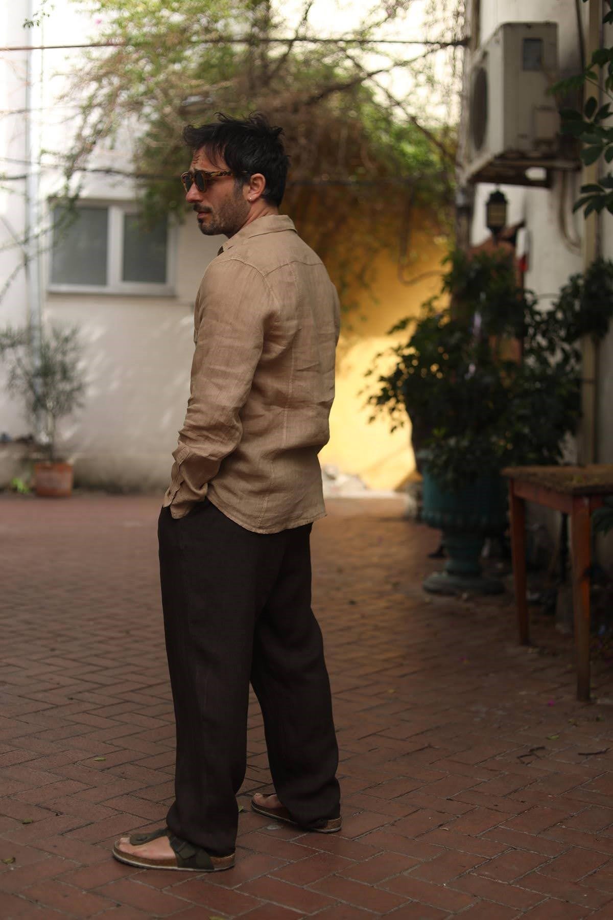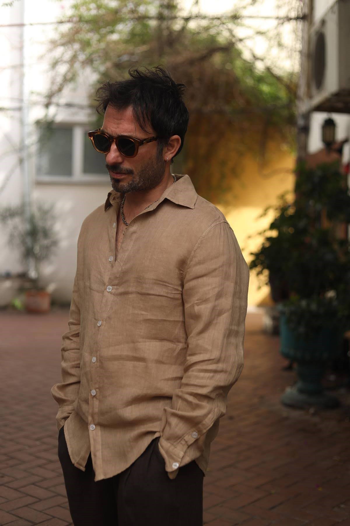 Camel Rengi Keten Klasik Erkek Gömlek