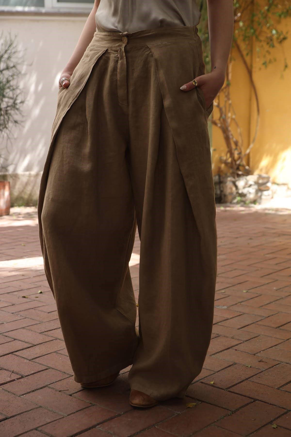 Camel Rengi Pileli Bol Paça Keten Pantolon