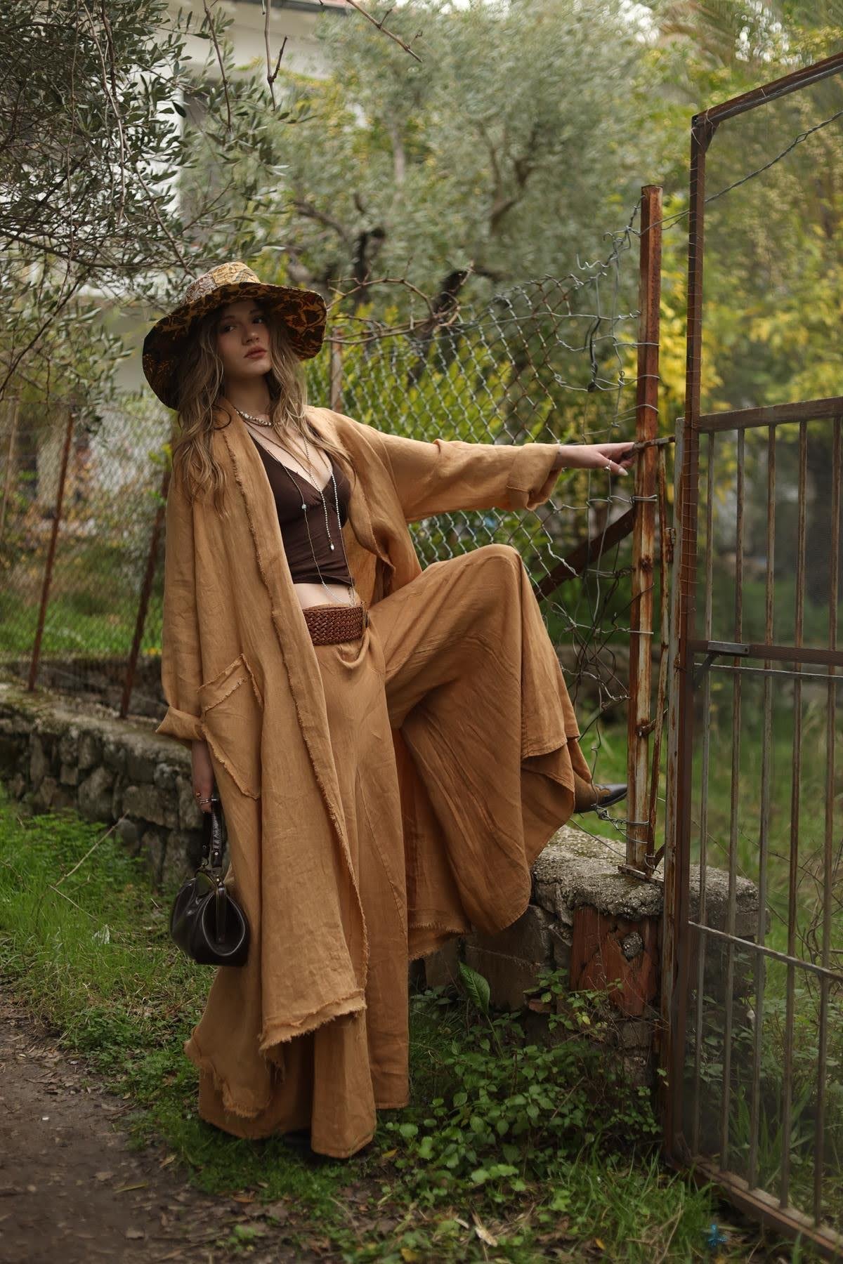 Camel Rengi Püskül Detaylı Cepli Keten Kaftan