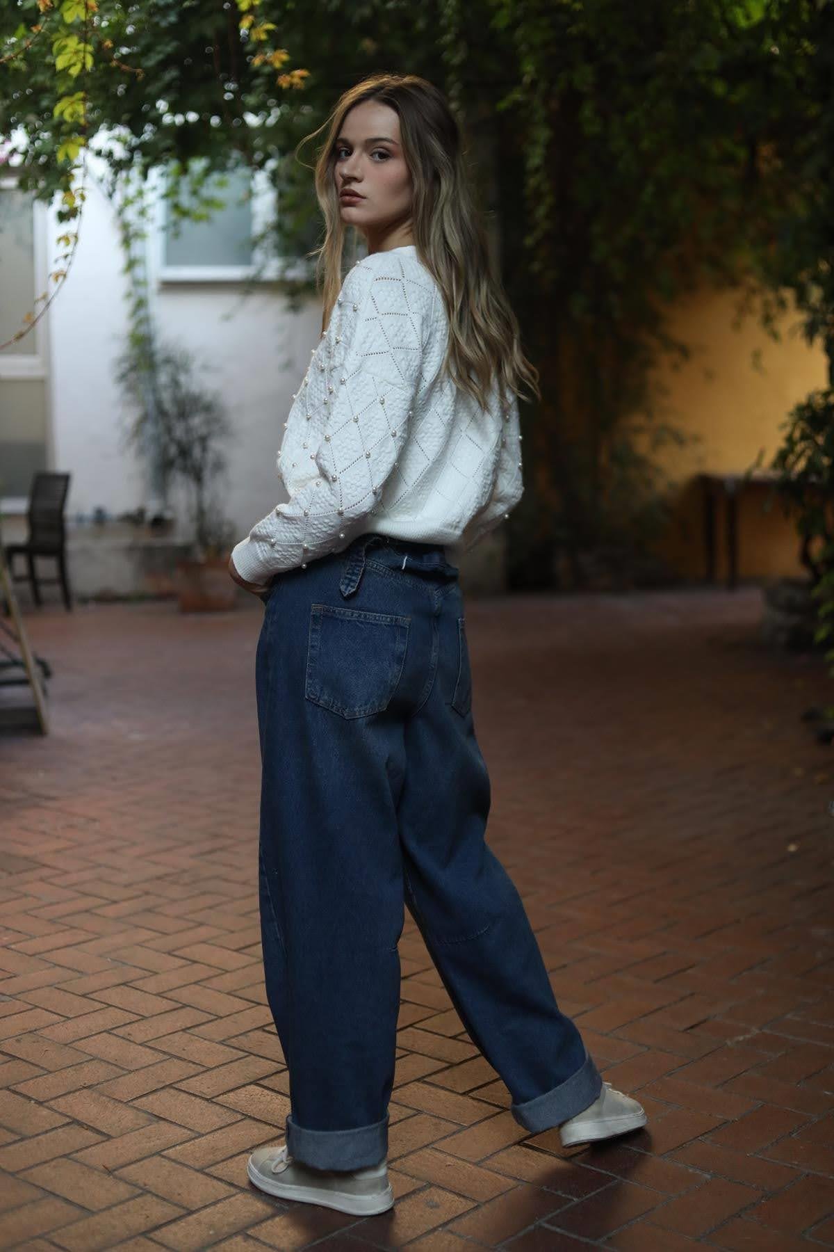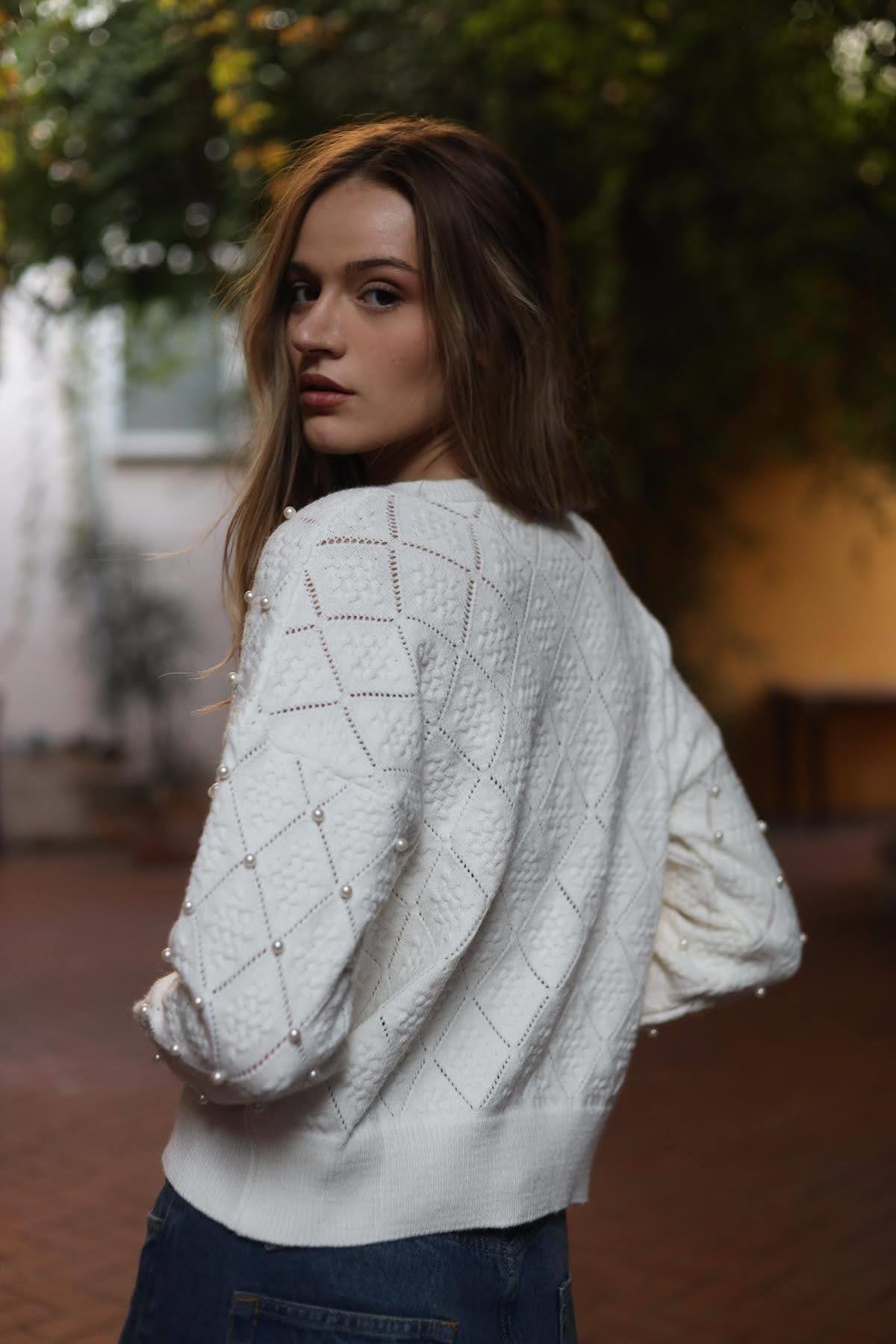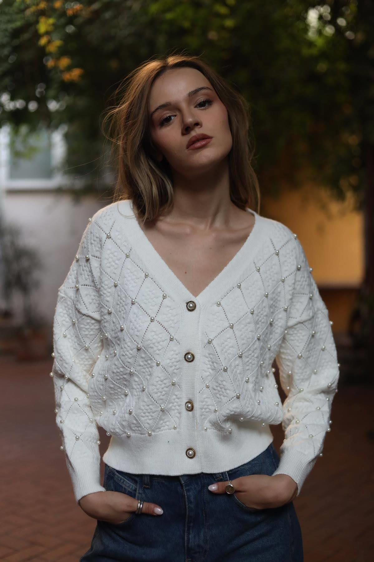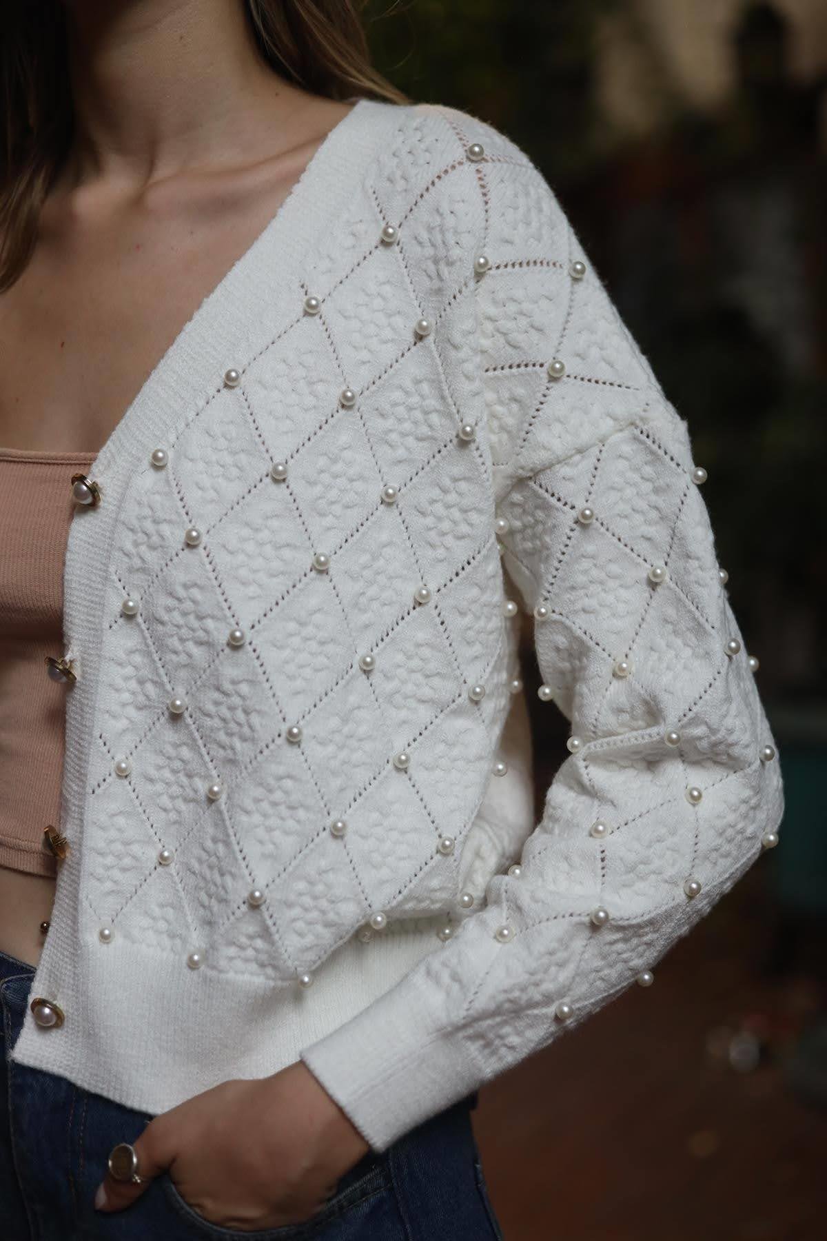 Ekru Baklava Desenli İnci Düğmeli İşlemeli Hırka