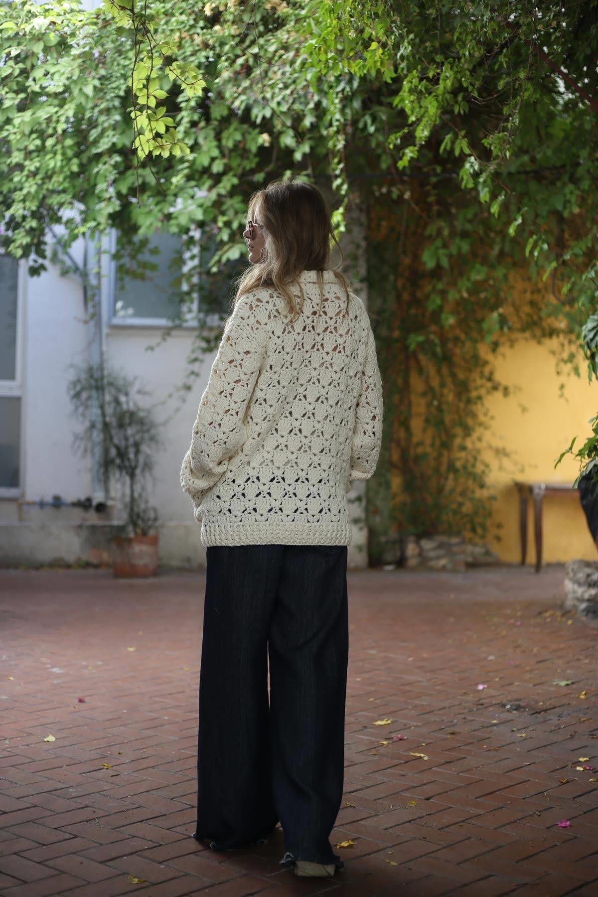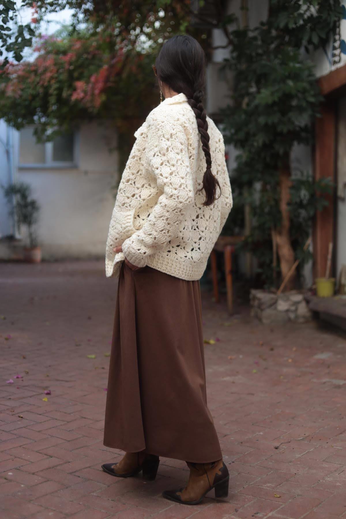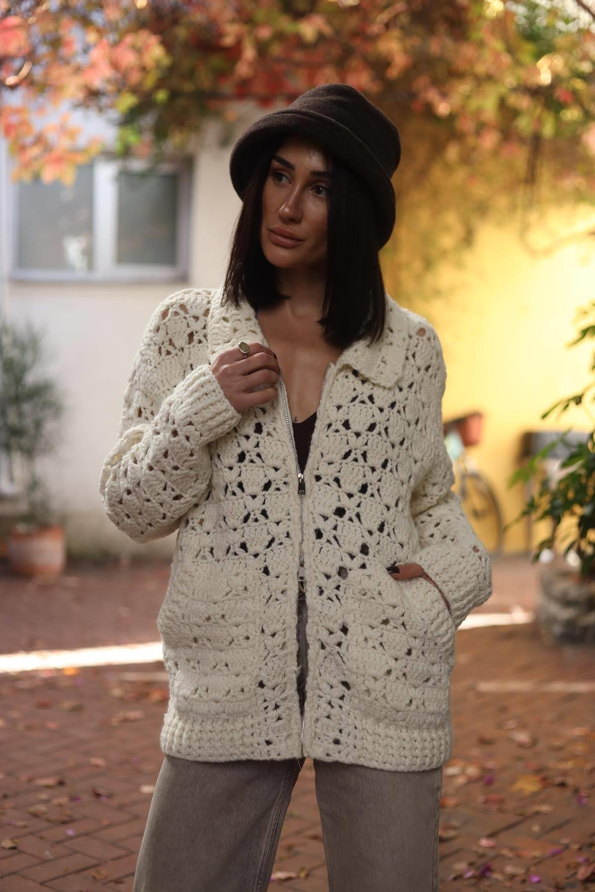 Ekru Gömlek Yaka Fermuarlı Örgü Hırka
