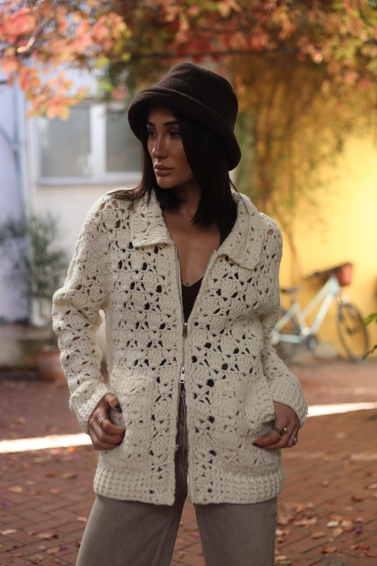 Ekru Gömlek Yaka Fermuarlı Örgü Hırka (KH-AS-005-AK-EK-STD)