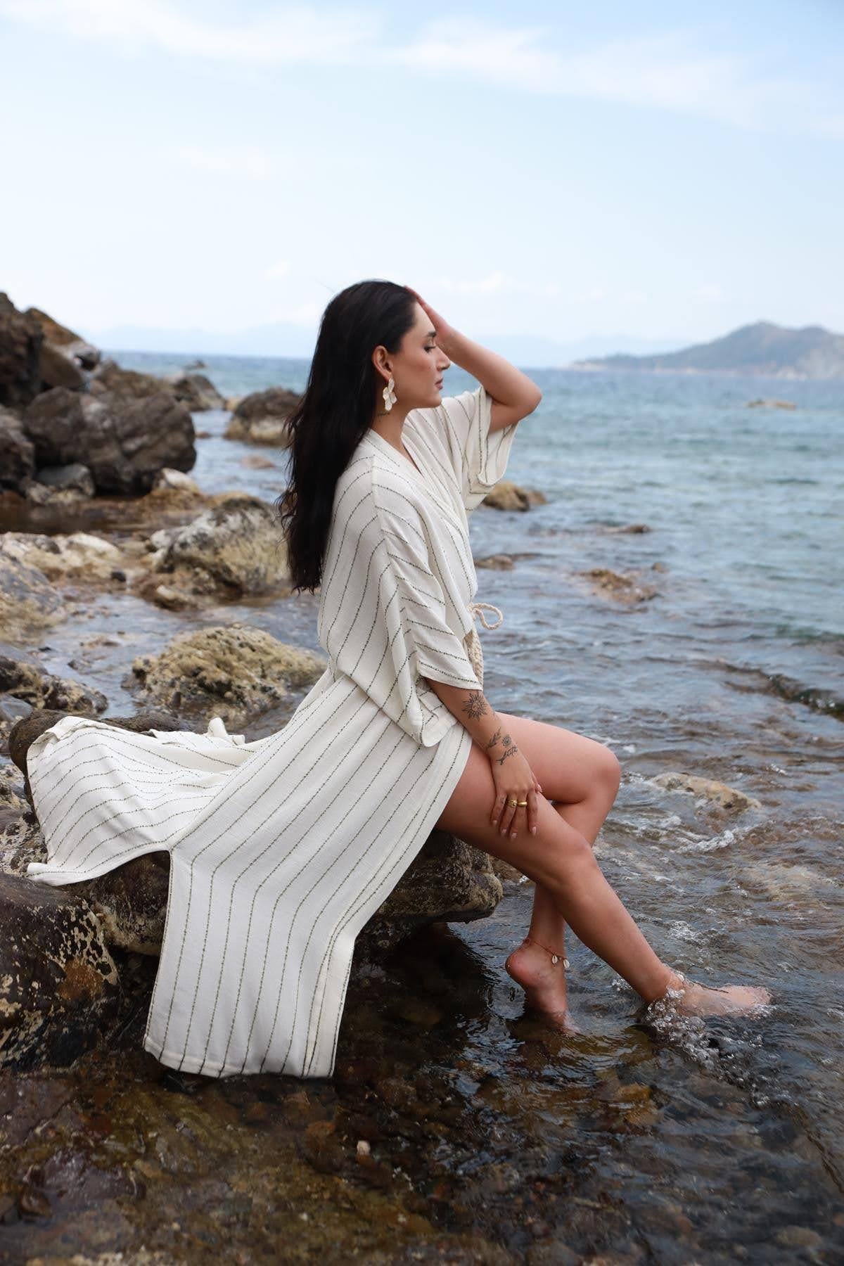 Ekru Haki Şerit Detaylı Yırtmaçlı Kaftan