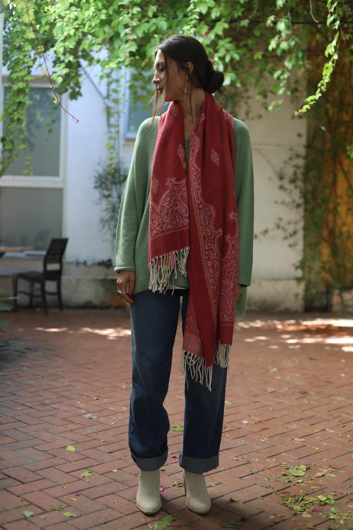 Fuşya Desenli Püsküllü Kaşmir Şal