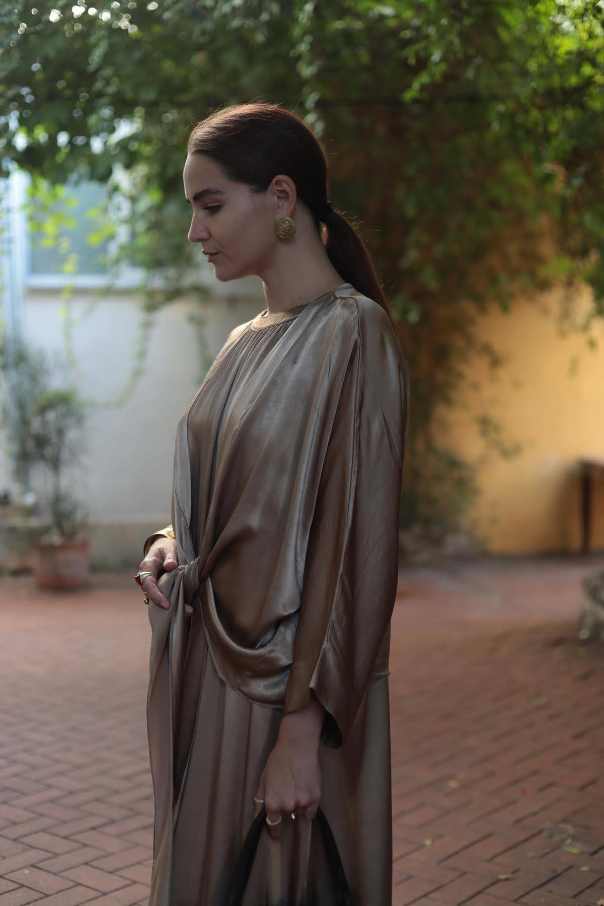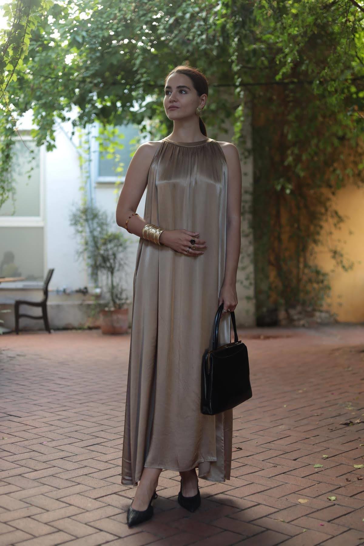 Gold Rengi Saten Halter Yaka Elbise ve Bolero Takım