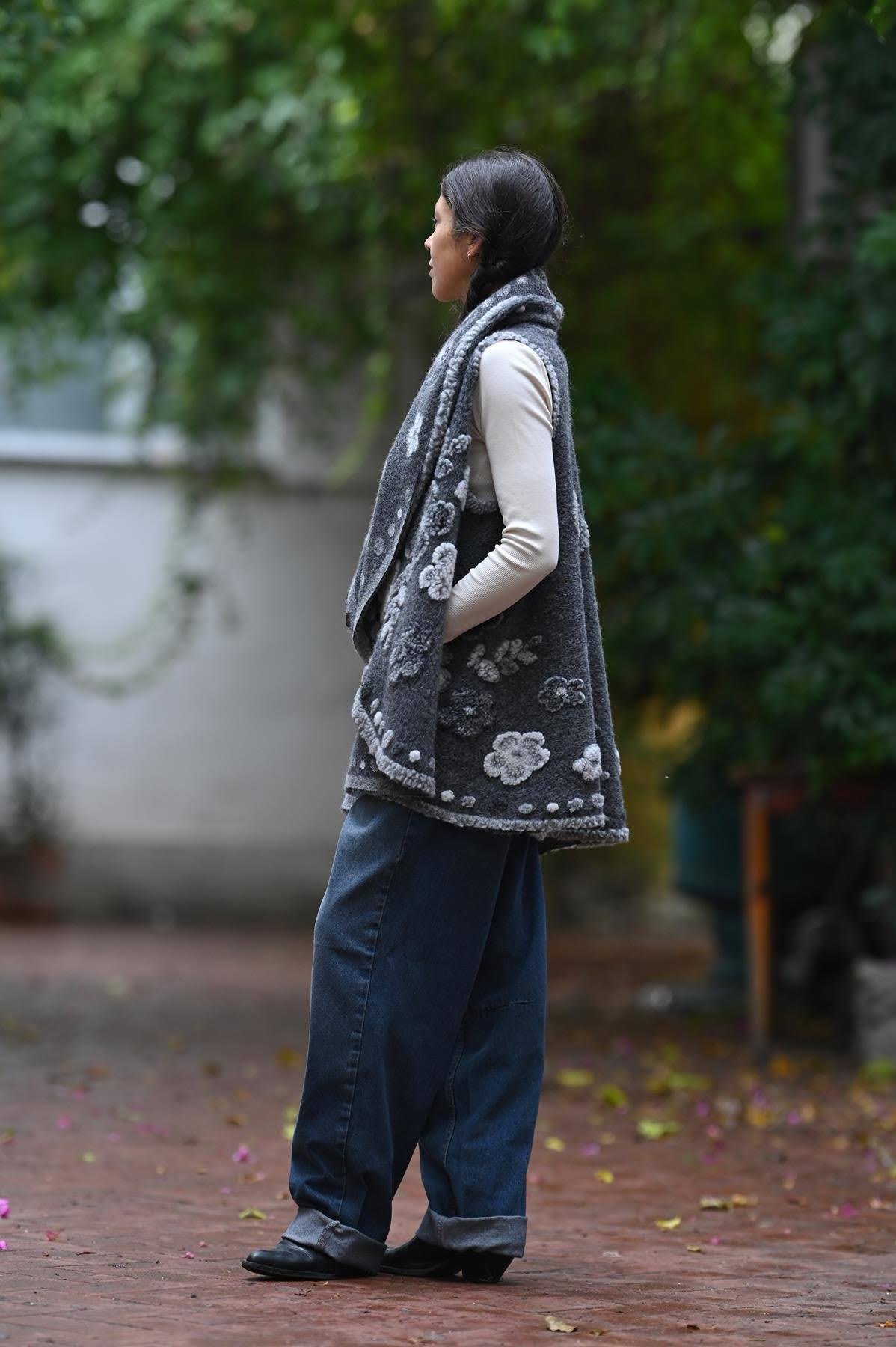 Gri Çiçek Desenli Keçe Yelek