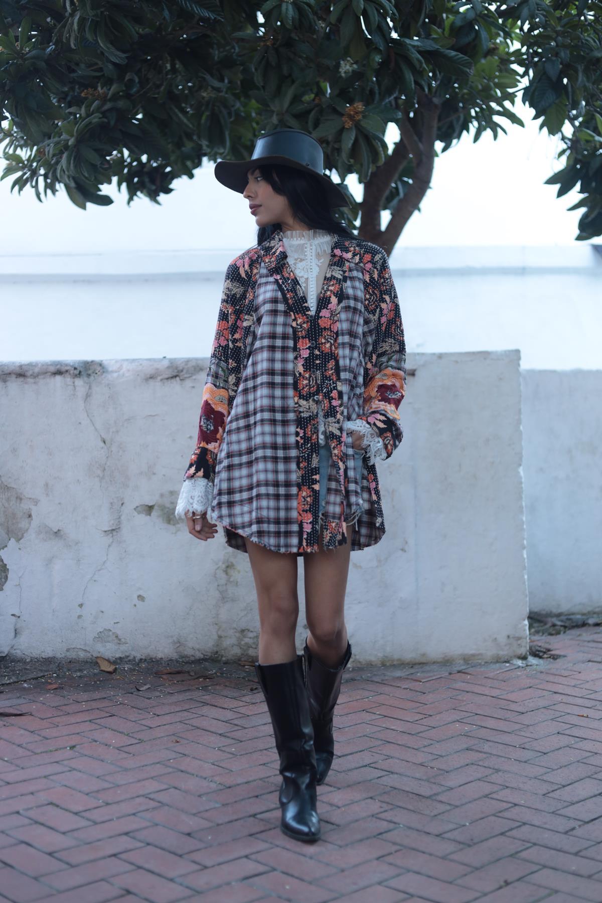 Gri Parça Detaylı Sahte Düğmeli Nakışlı Ekose Tunik (KTNK-NAT-001-PA-GR-S)