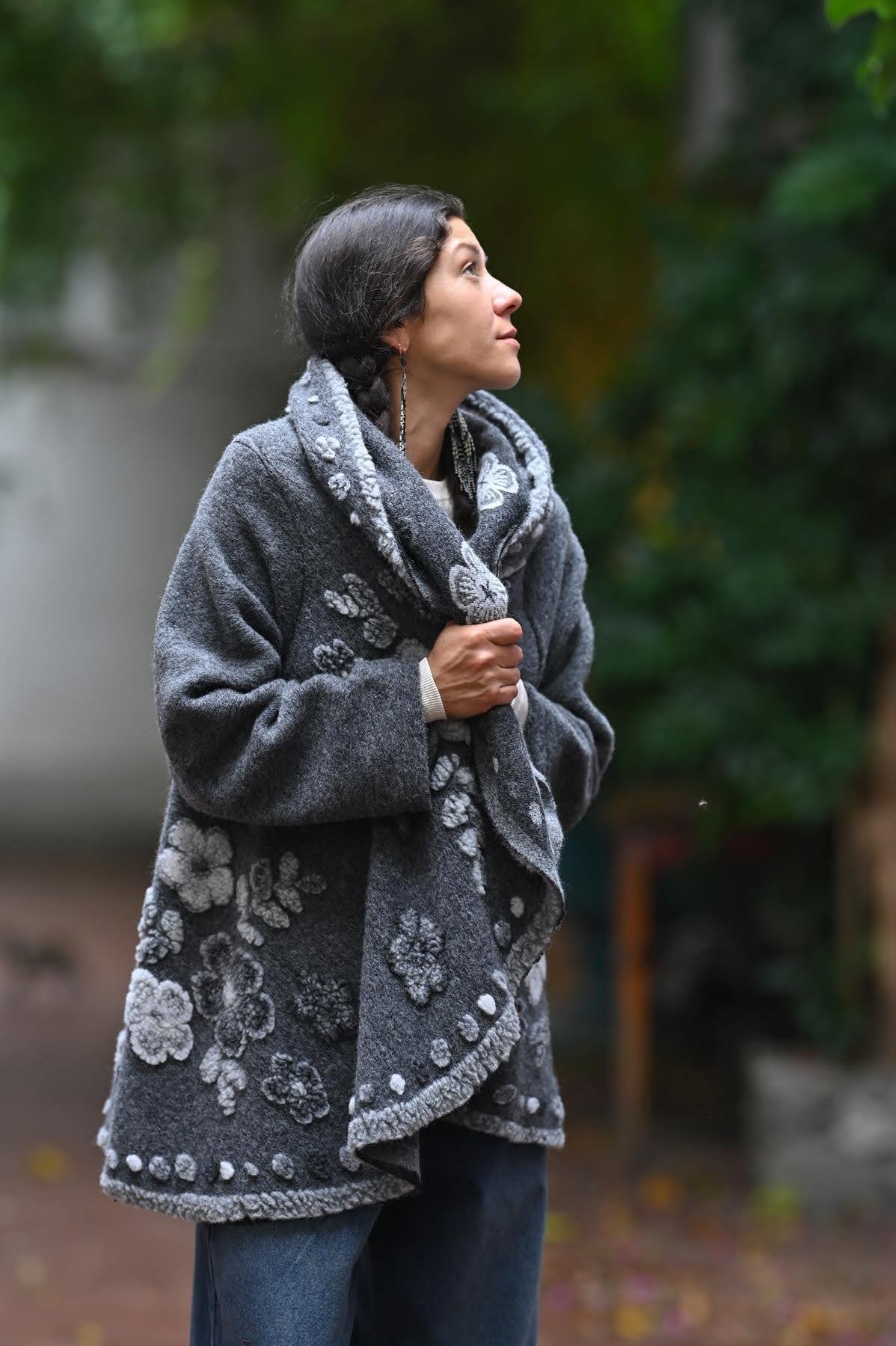 Gri Şal Yaka Çiçek Desenli Keçe Ceket