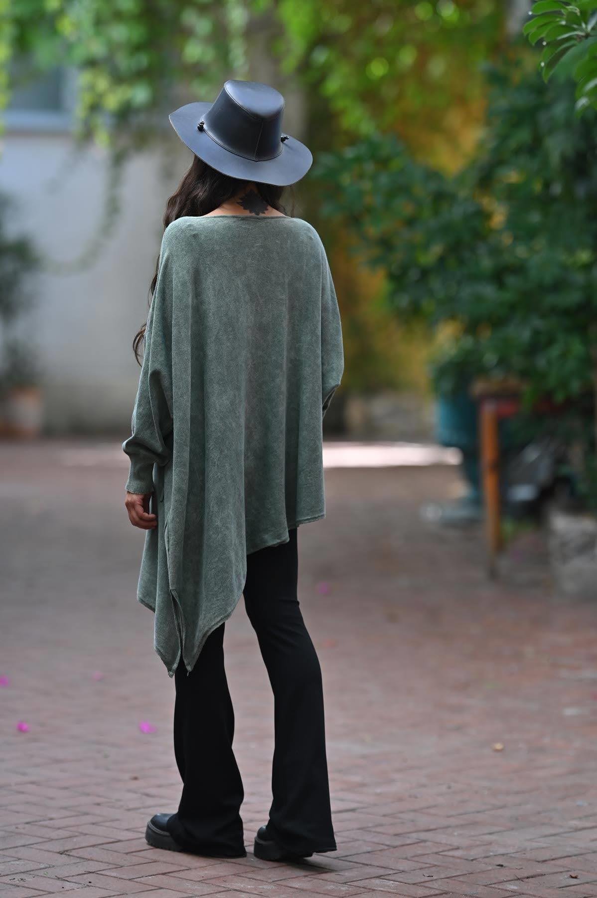 Haki Asimetrik Kesim Yıkamalı Tunik