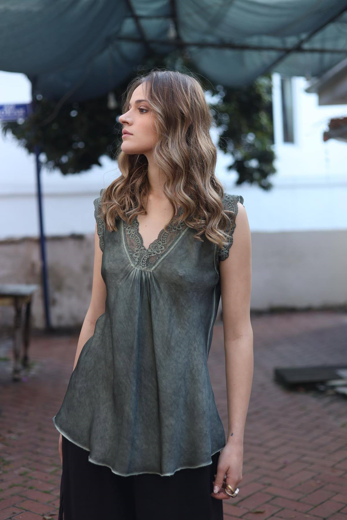Haki Dantel Detaylı Kolsuz Bluz (KB-ZA-009-VI-HA-STD)