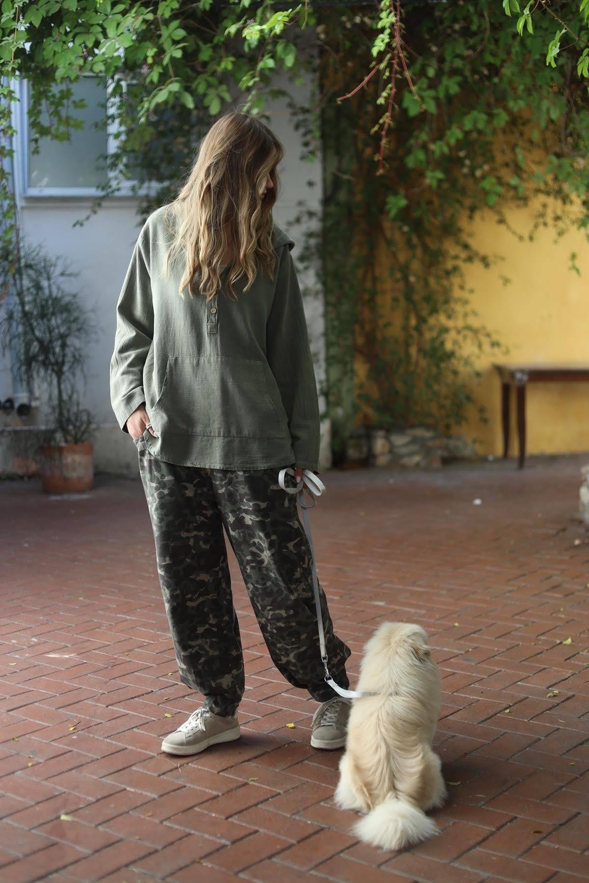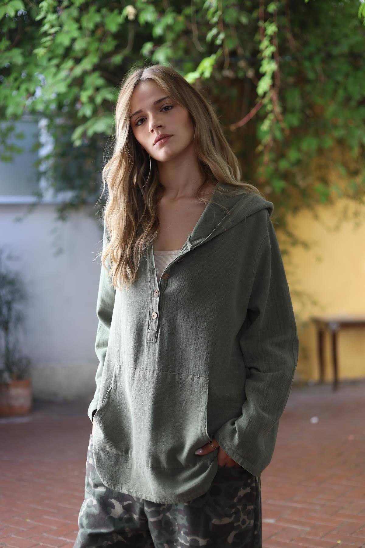 Haki Düğmeli Kanguru Cepli Kapüşonlu Sweat