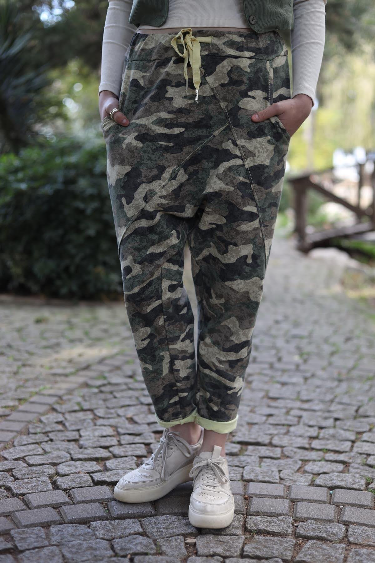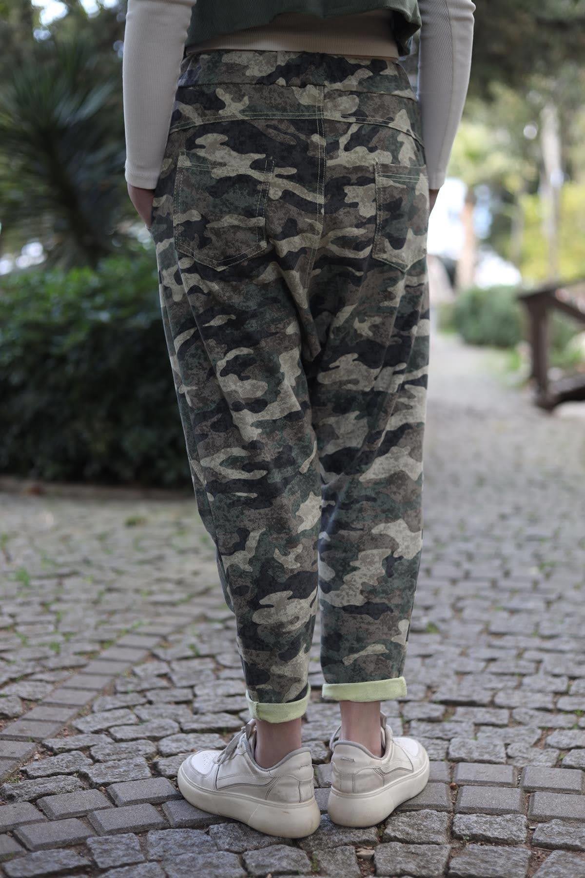 Haki Önü Dikişli Beli İpli Kamuflaj Pantolon