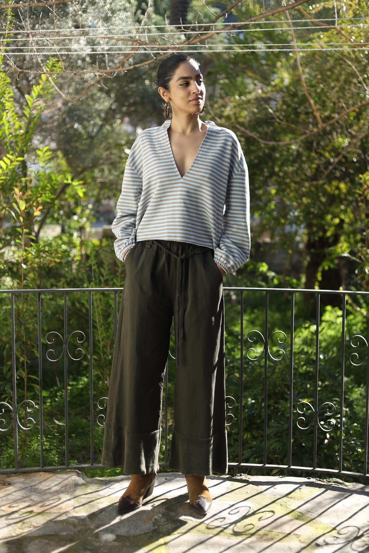 Haki Parça Detaylı Geniş Paça Pantolon