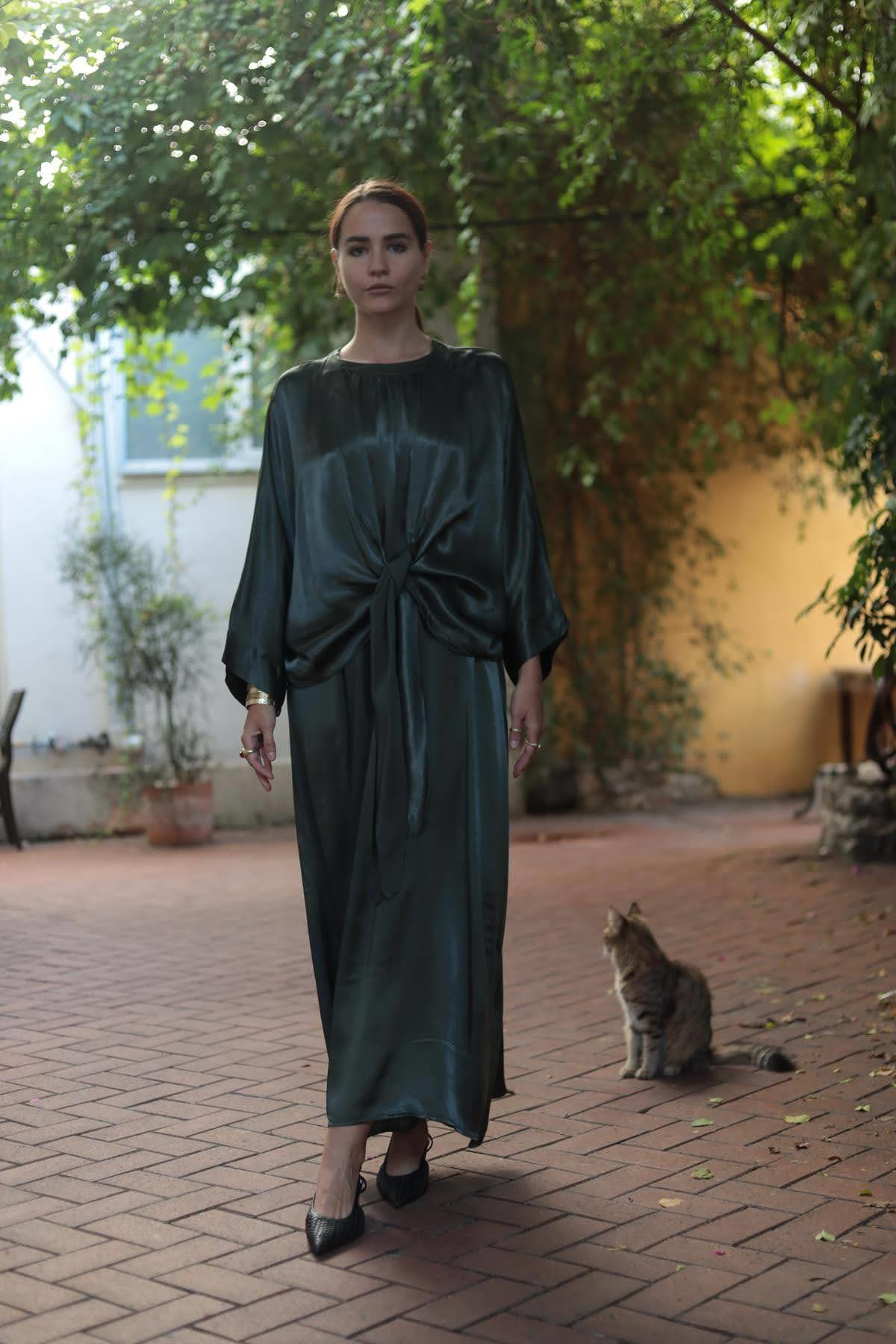 Haki Saten Halter Yaka Elbise ve Bolero Takım