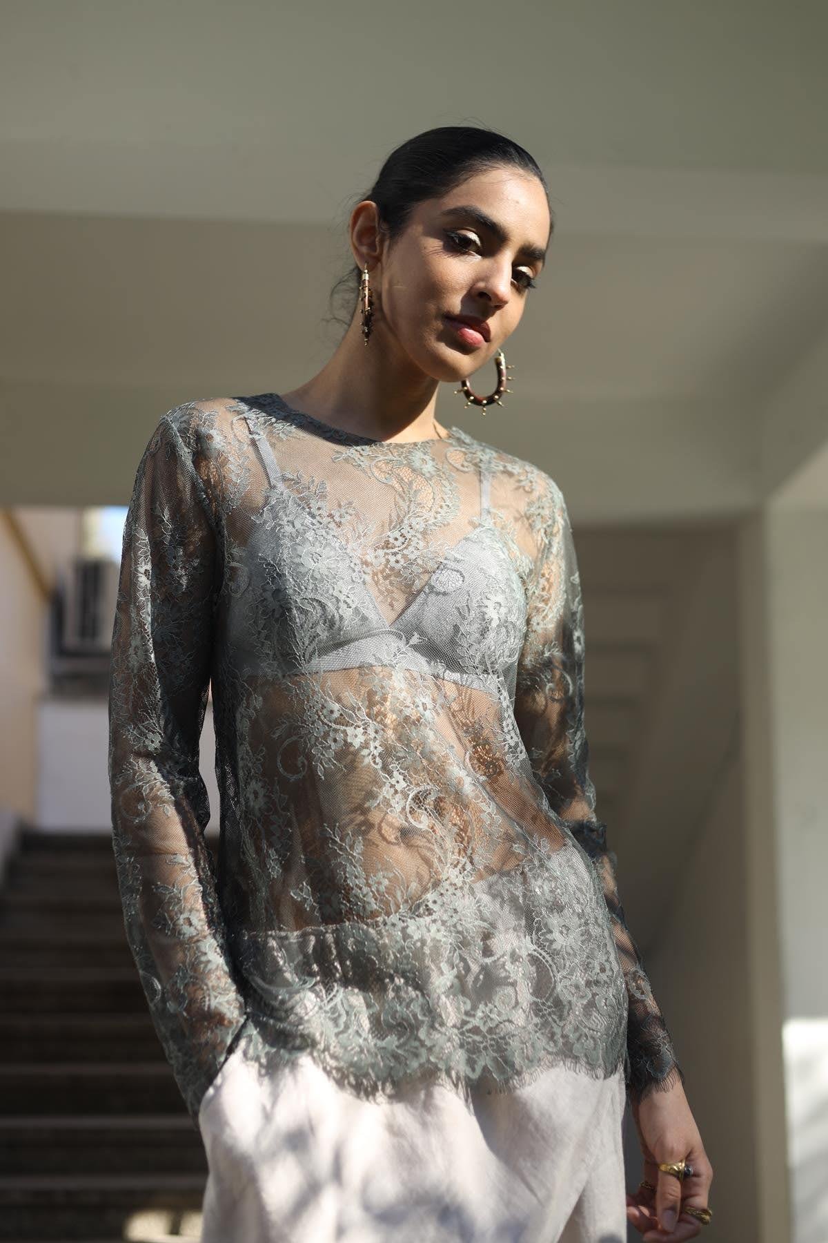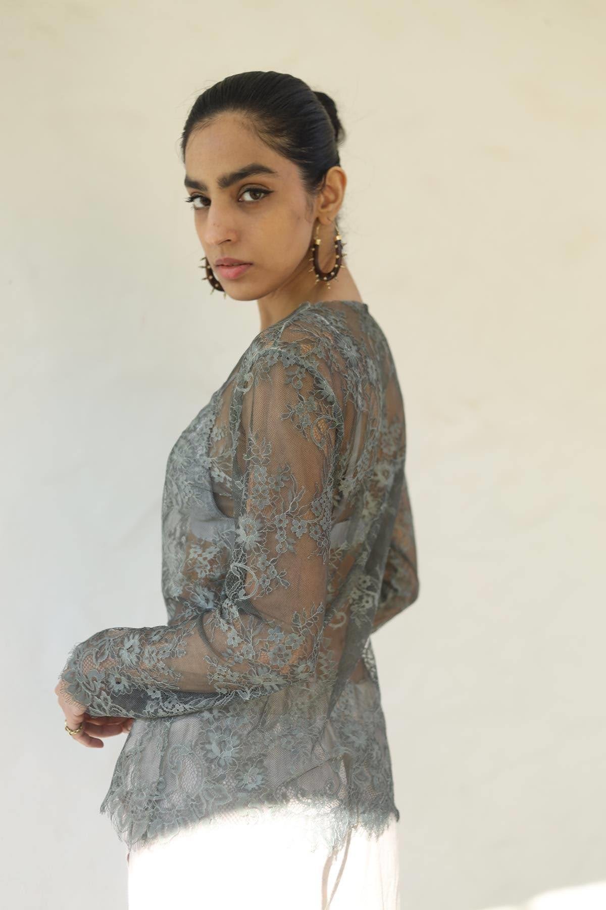 Haki Uzun Kollu Dantel Bluz