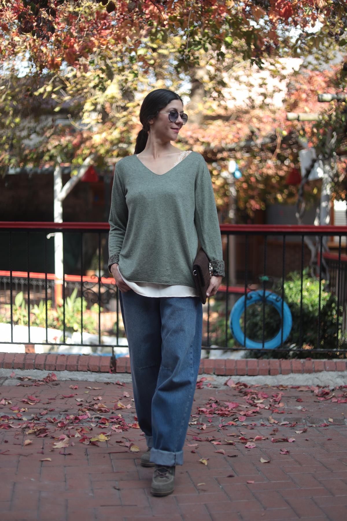 Haki V Yaka İçi Çiçek Desenli Triko Bluz