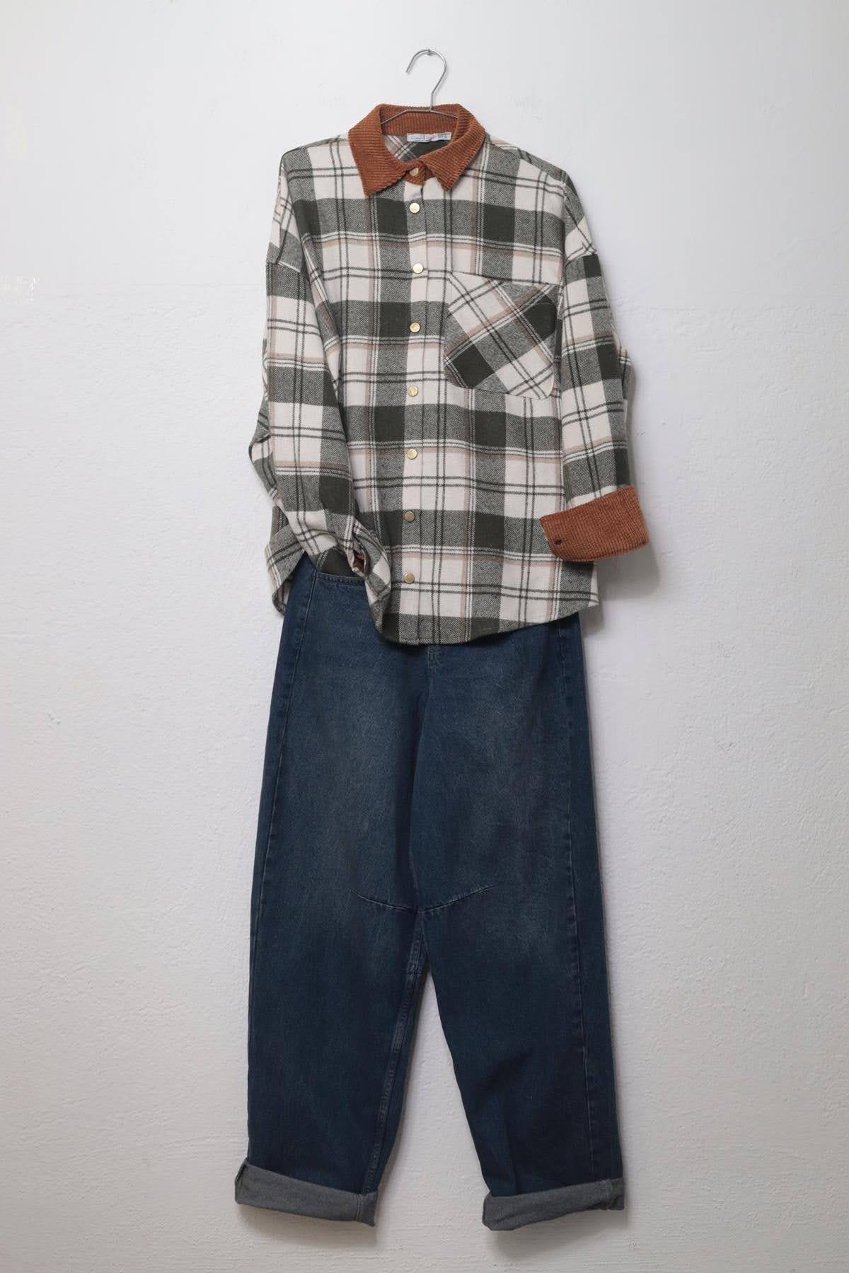 Haki Yakası Kadife Ekose Oduncu Gömlek