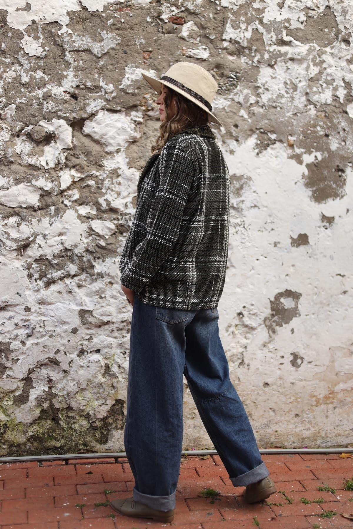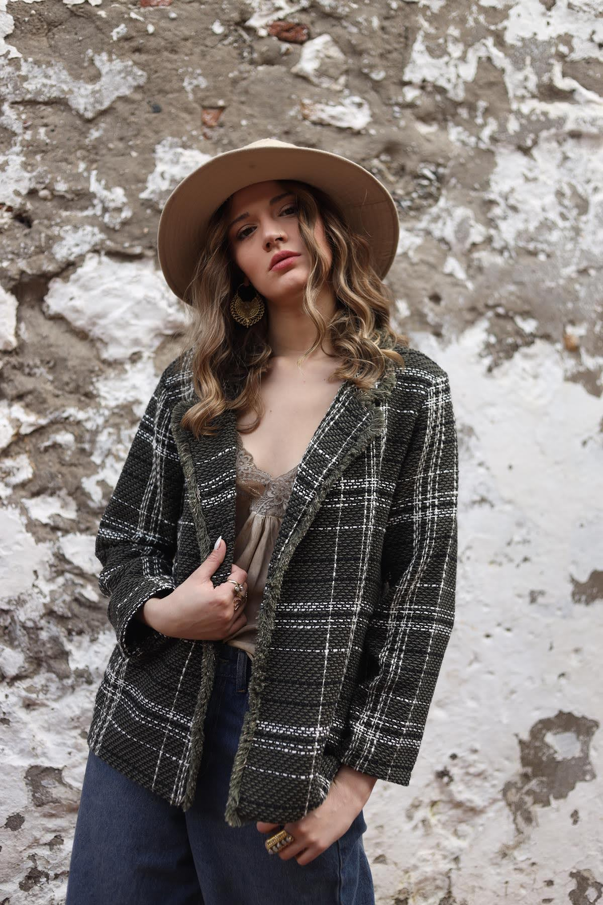 Haki Yakası Saçaklı Ekose Ceket