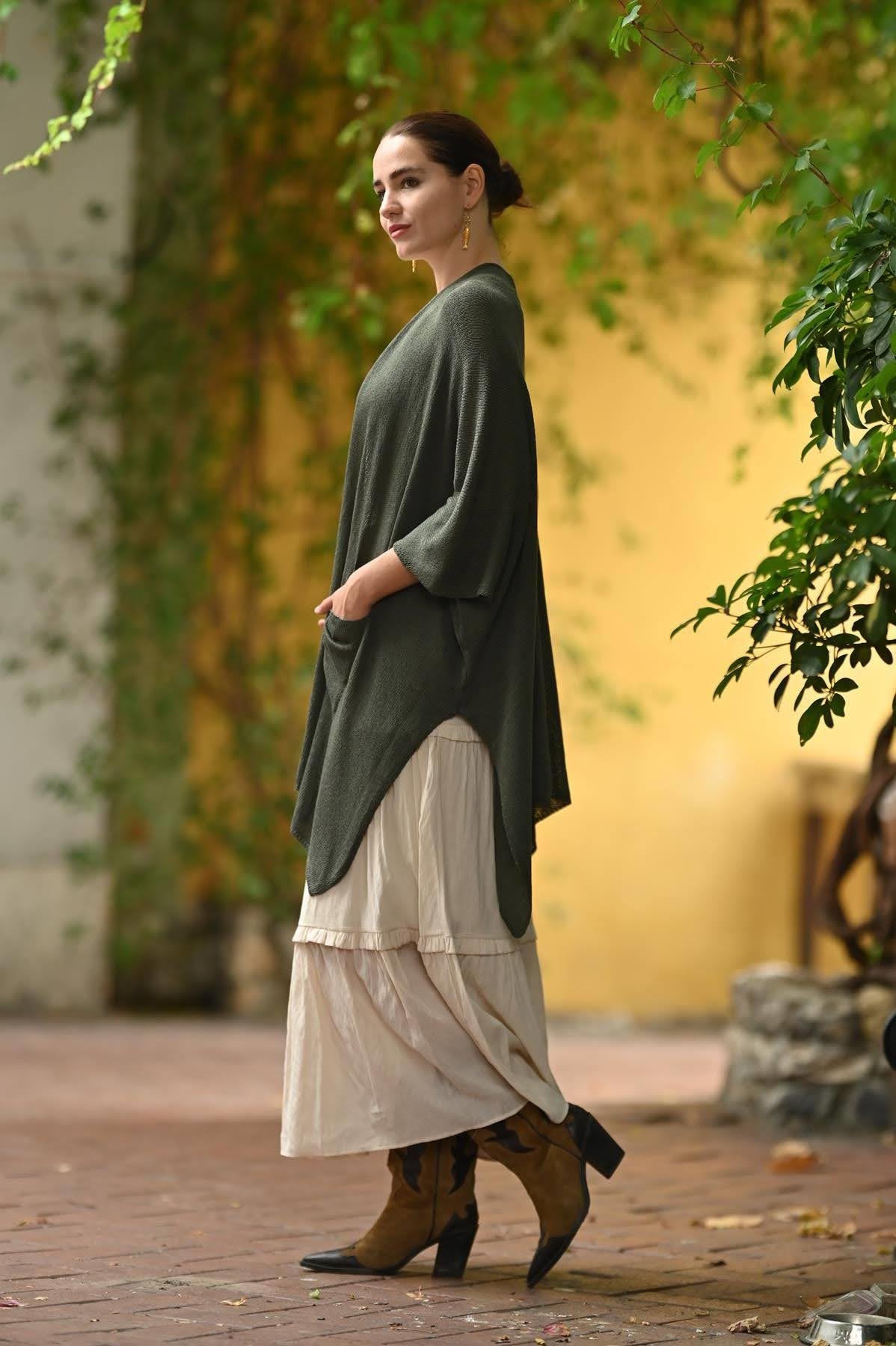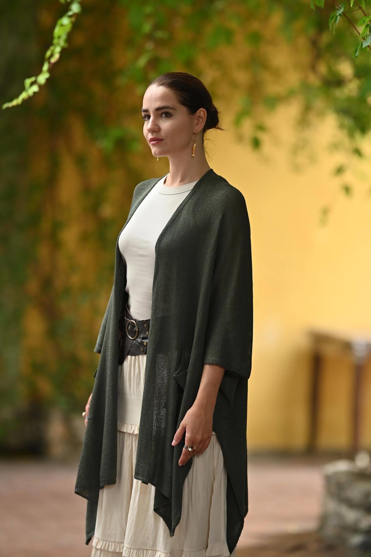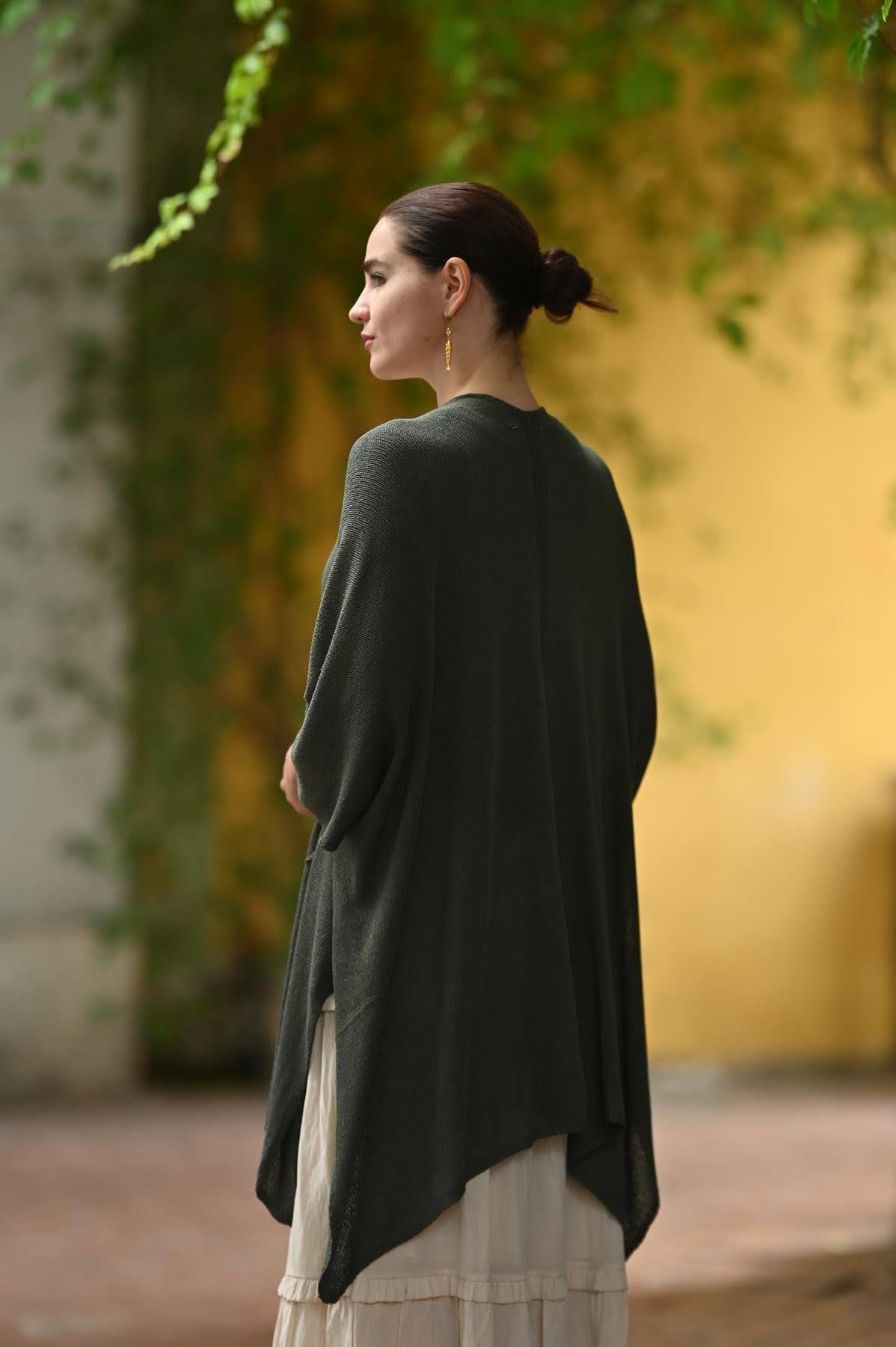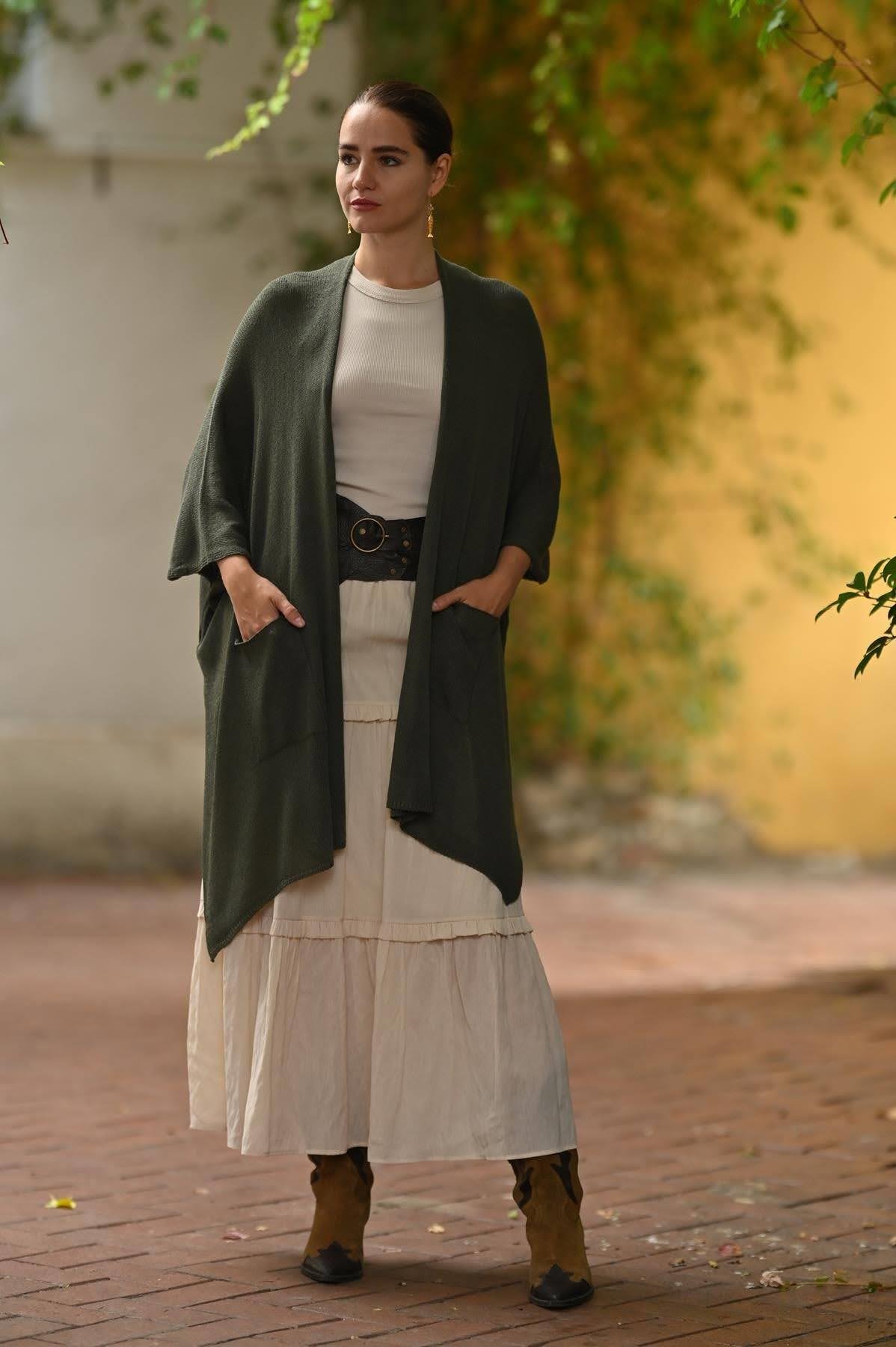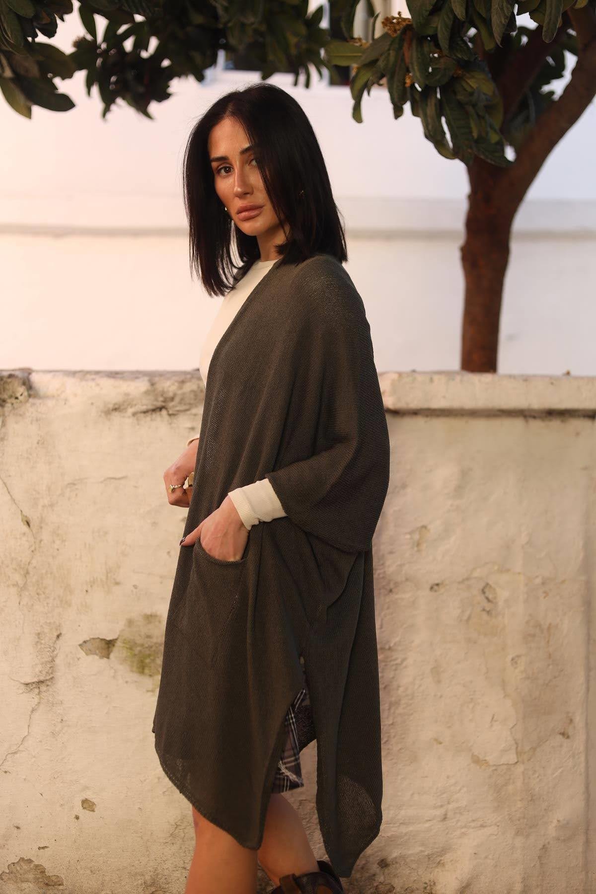 Haki Yanları Yırtmaçlı Cepli Triko Hırka
