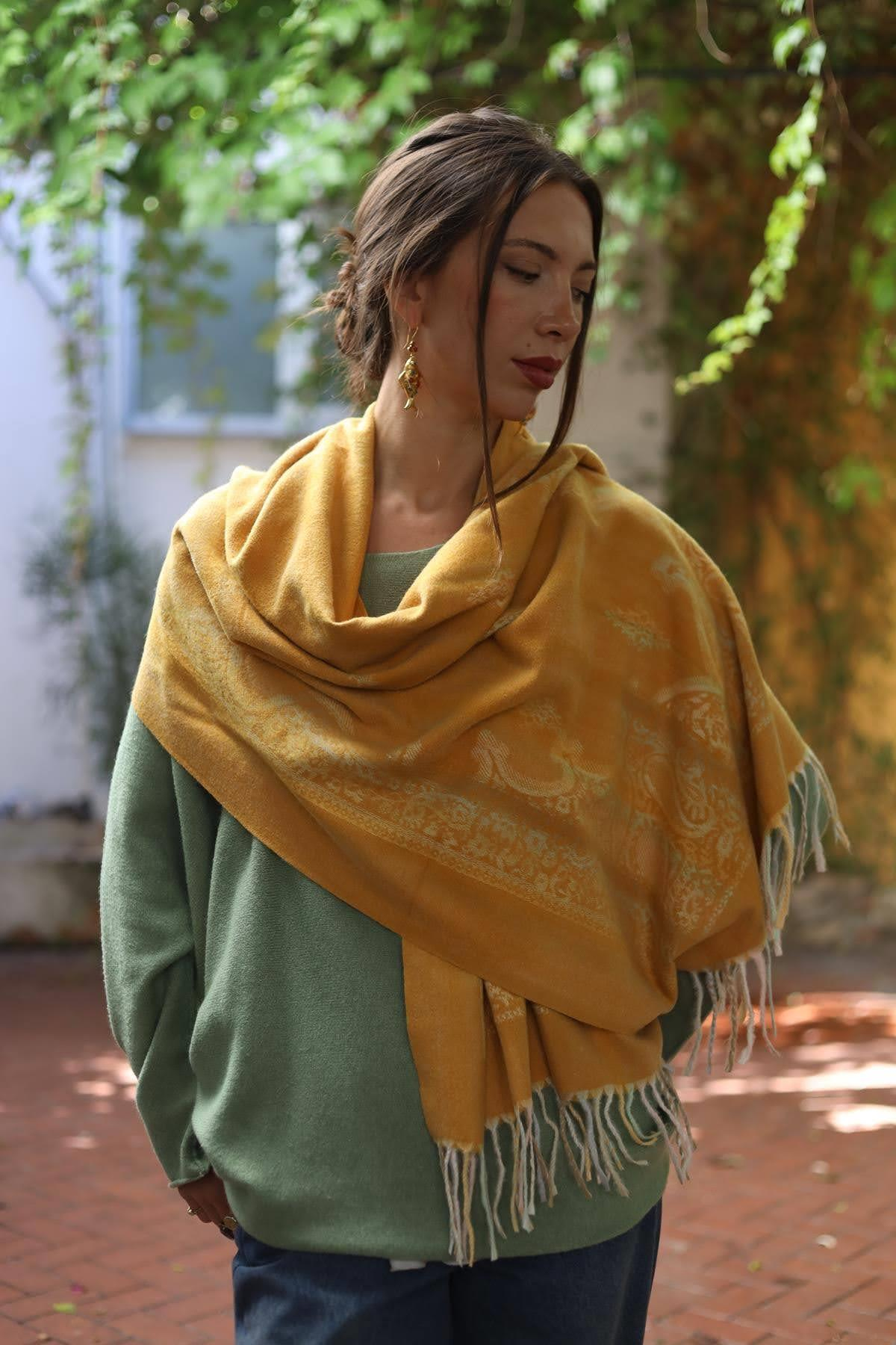 Hardal Rengi Desenli Püsküllü Kaşmir Şal (ASL-FAL-004-PA-HAR-STD)