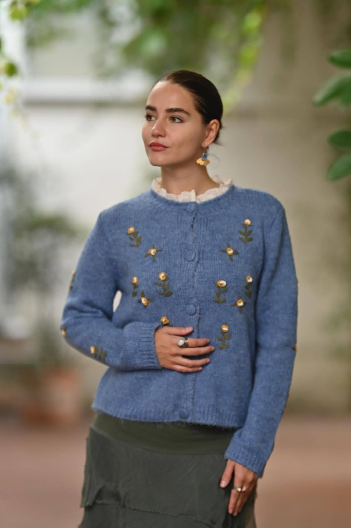 İndigo Mavi Çiçek Nakışlı Yakası Dantelli Hırka
