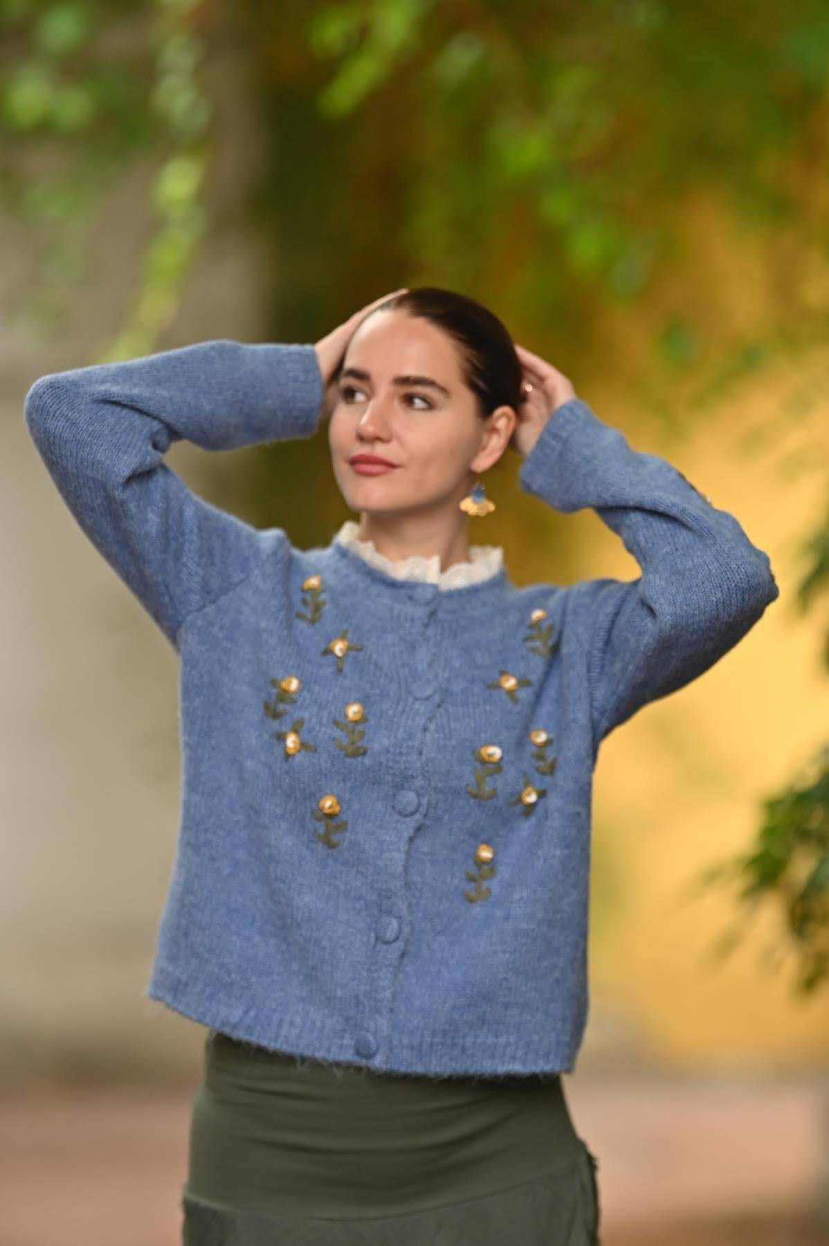 İndigo Mavi Çiçek Nakışlı Yakası Dantelli Hırka (KH-RBN-022-AK-IND-STD)
