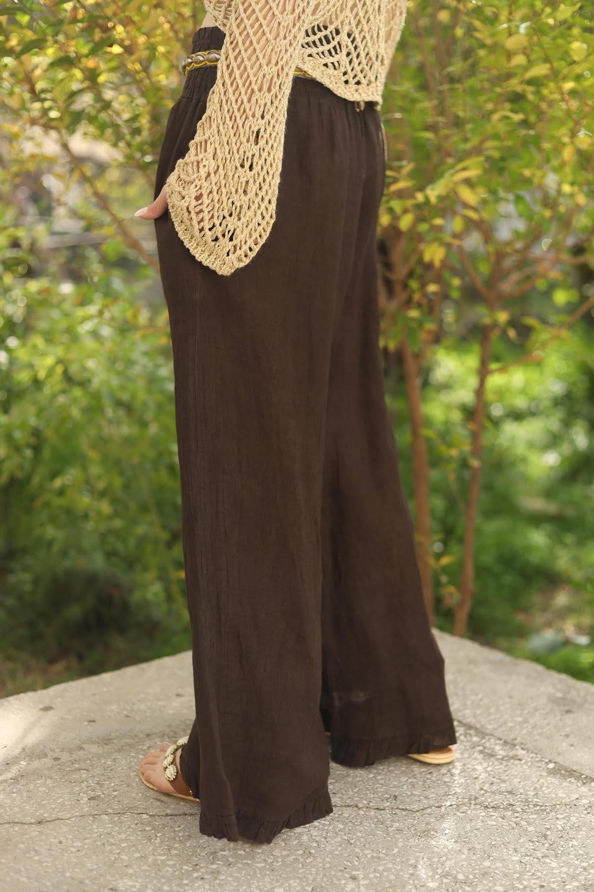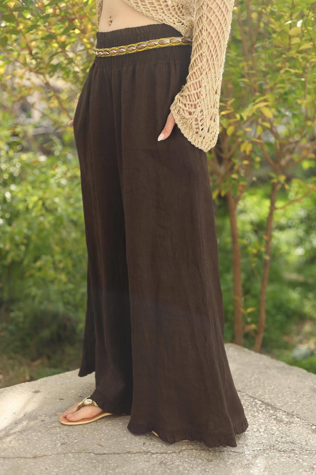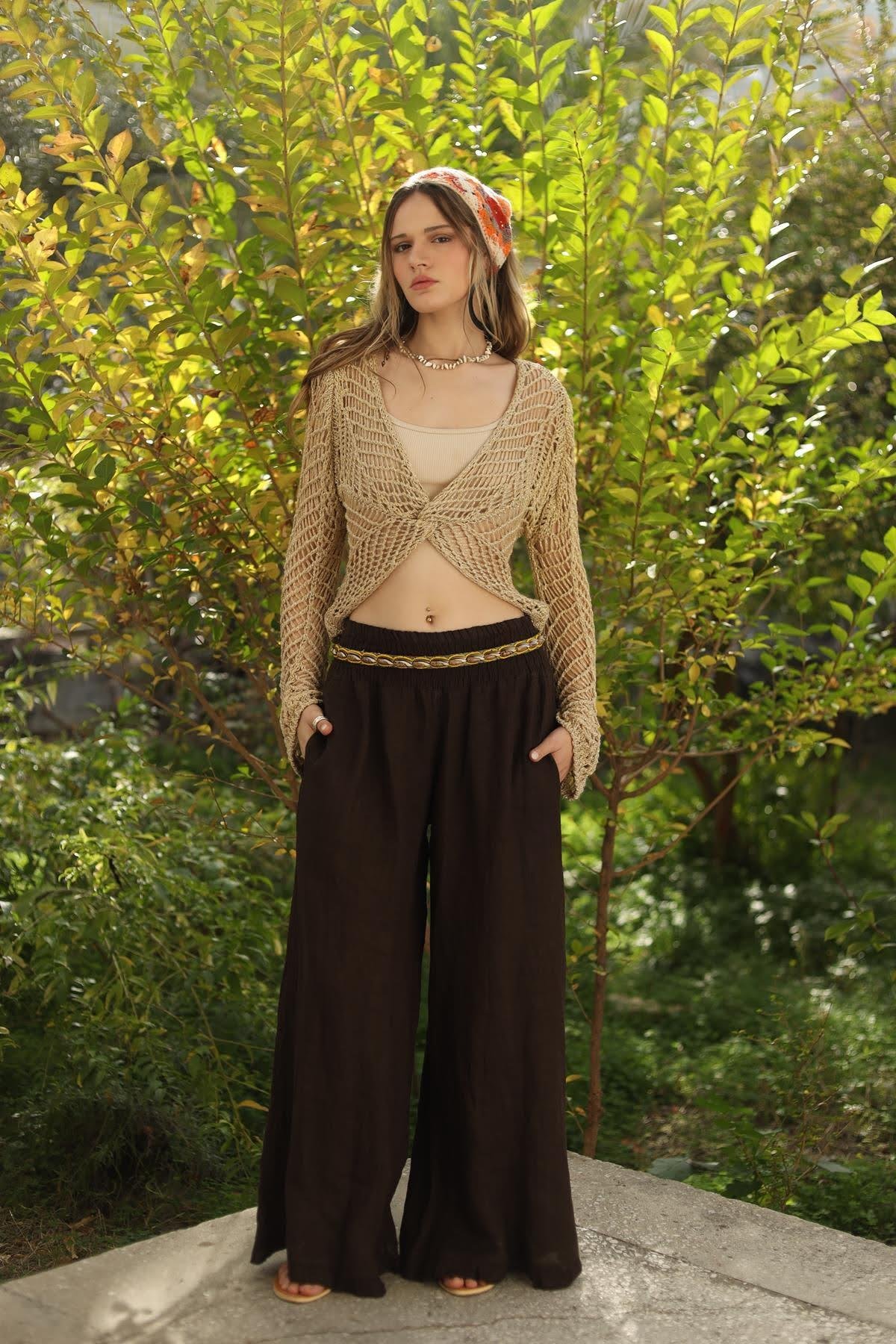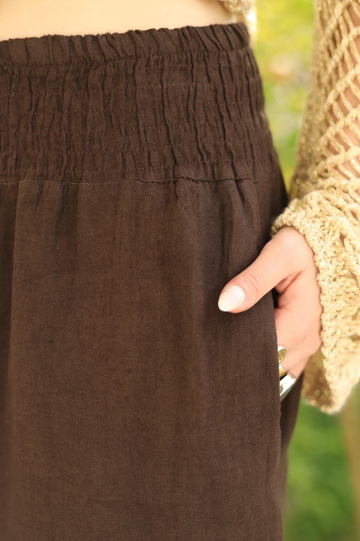Kahverengi Beli Gipeli Paça Detaylı Keten Pantolon