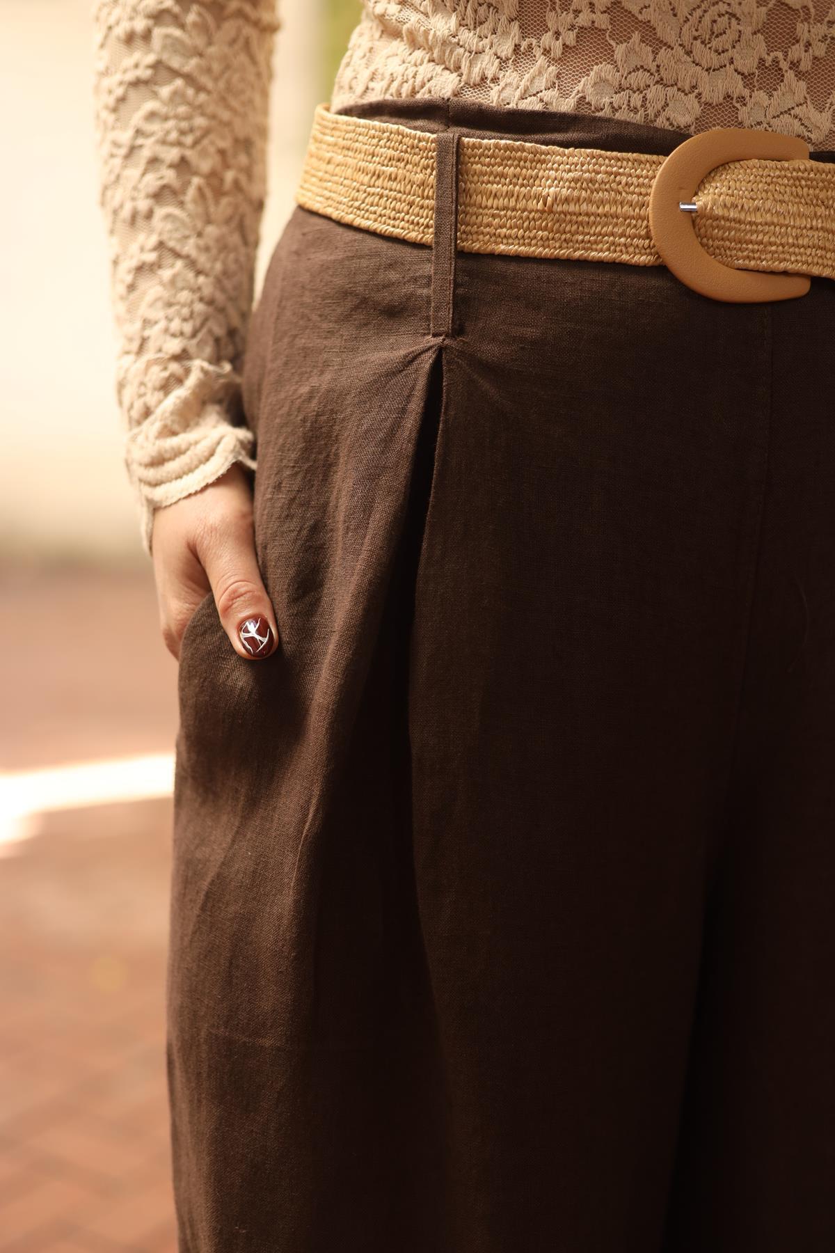 Kahverengi Beli Pileli Keten Palazzo Pantolon