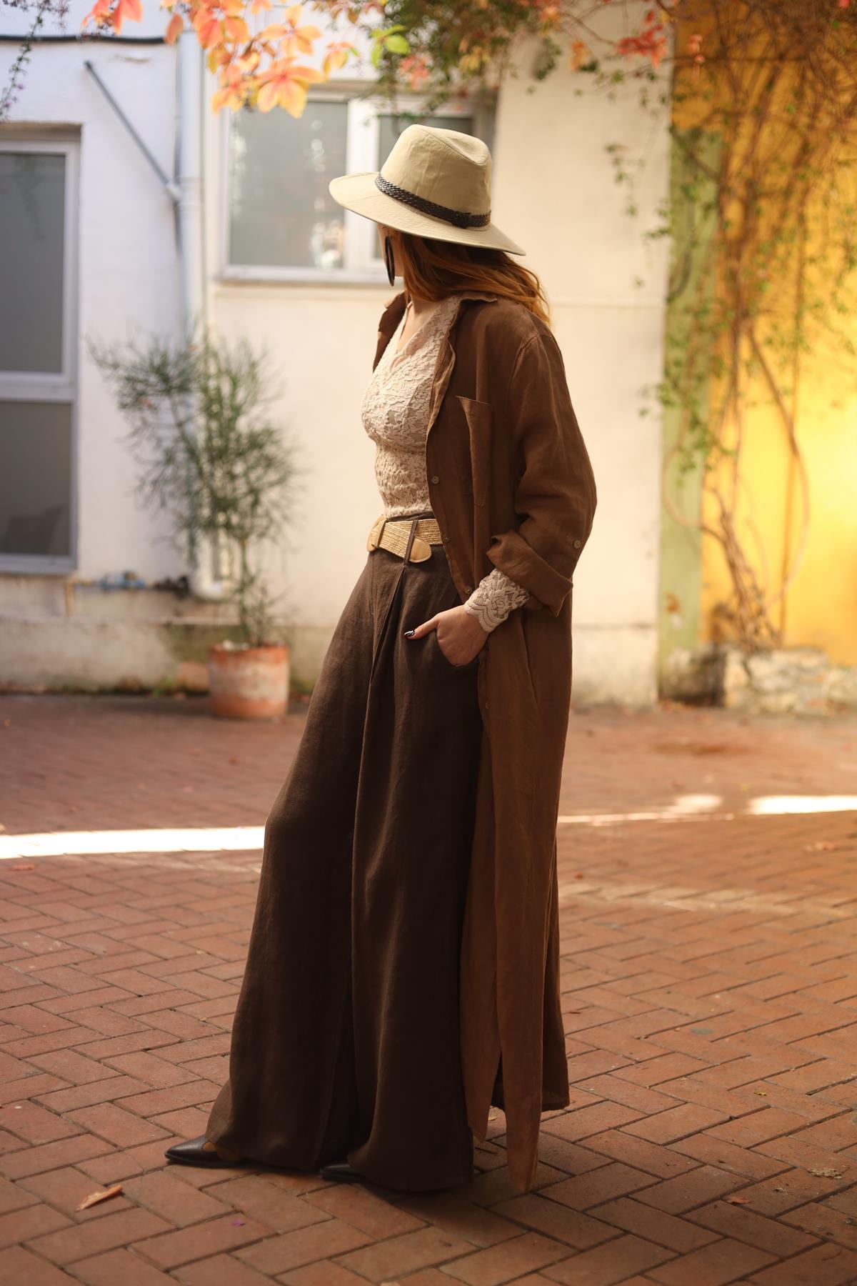 Kahverengi Beli Pileli Keten Palazzo Pantolon (KP-FAL-049-KTN-KA-STD)