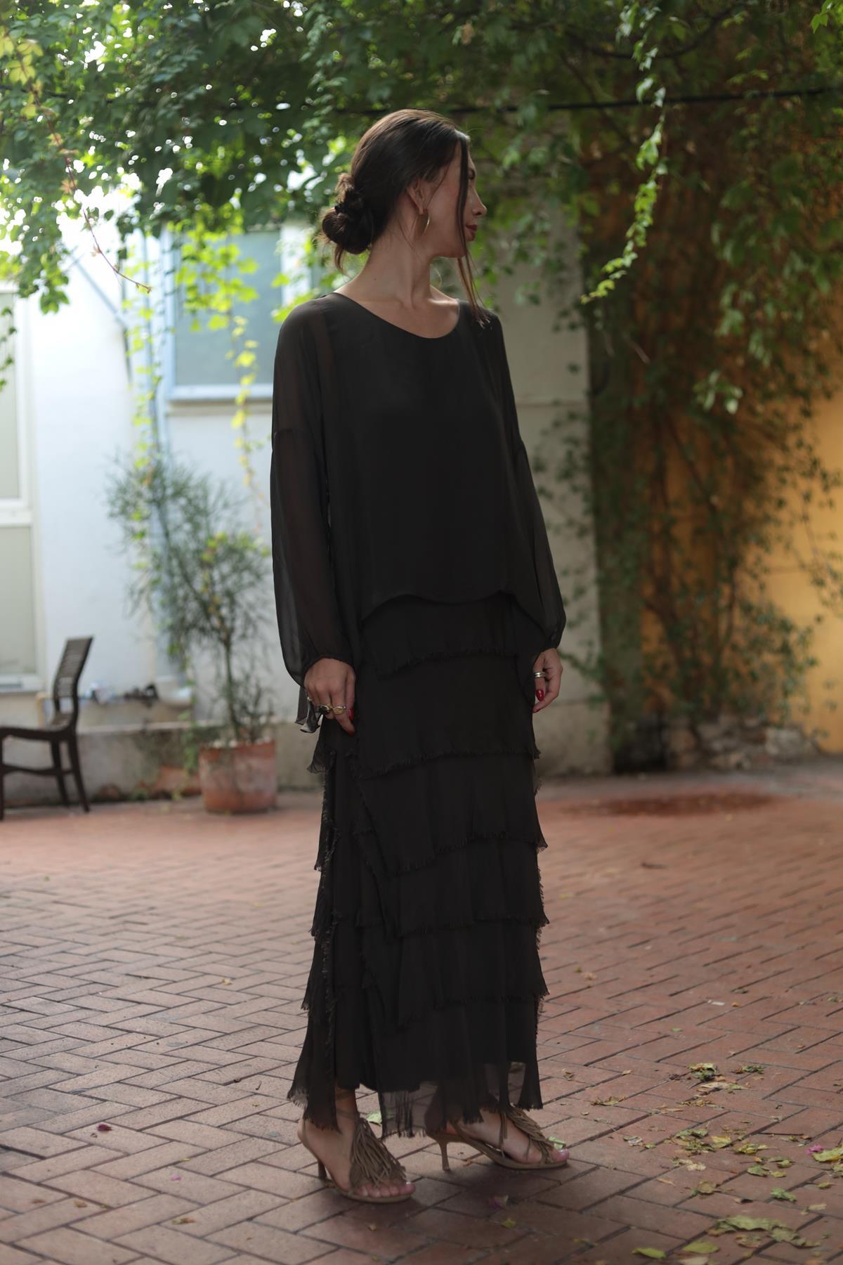 Kahverengi Bluz Detaylı Katlı İpek Elbise