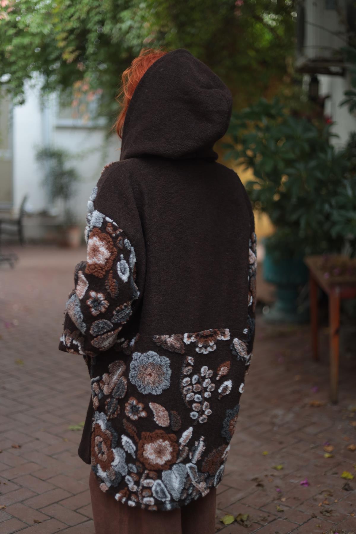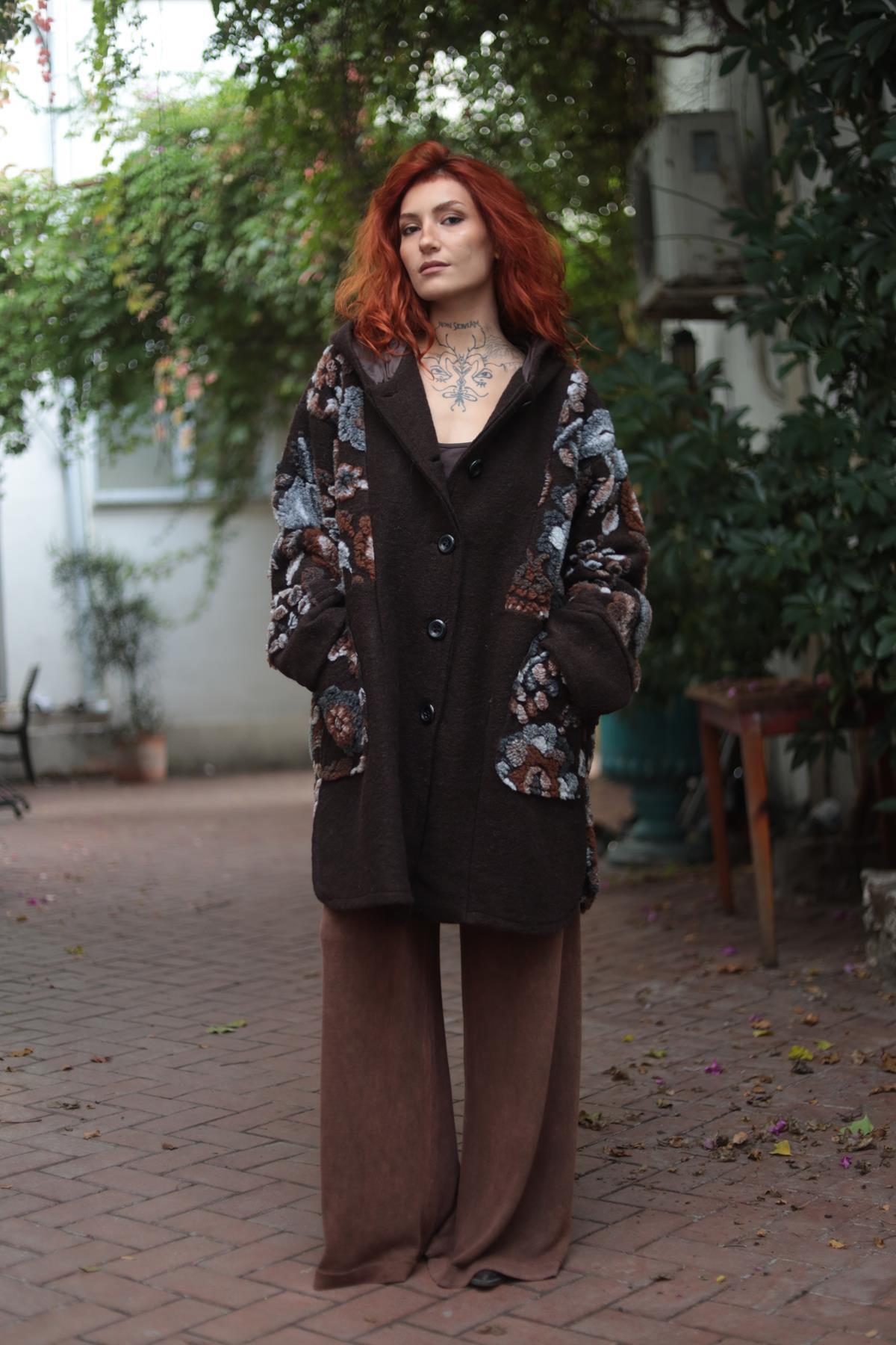 Kahverengi Çiçek Desenli Kapüşonlu Yün Kaban
