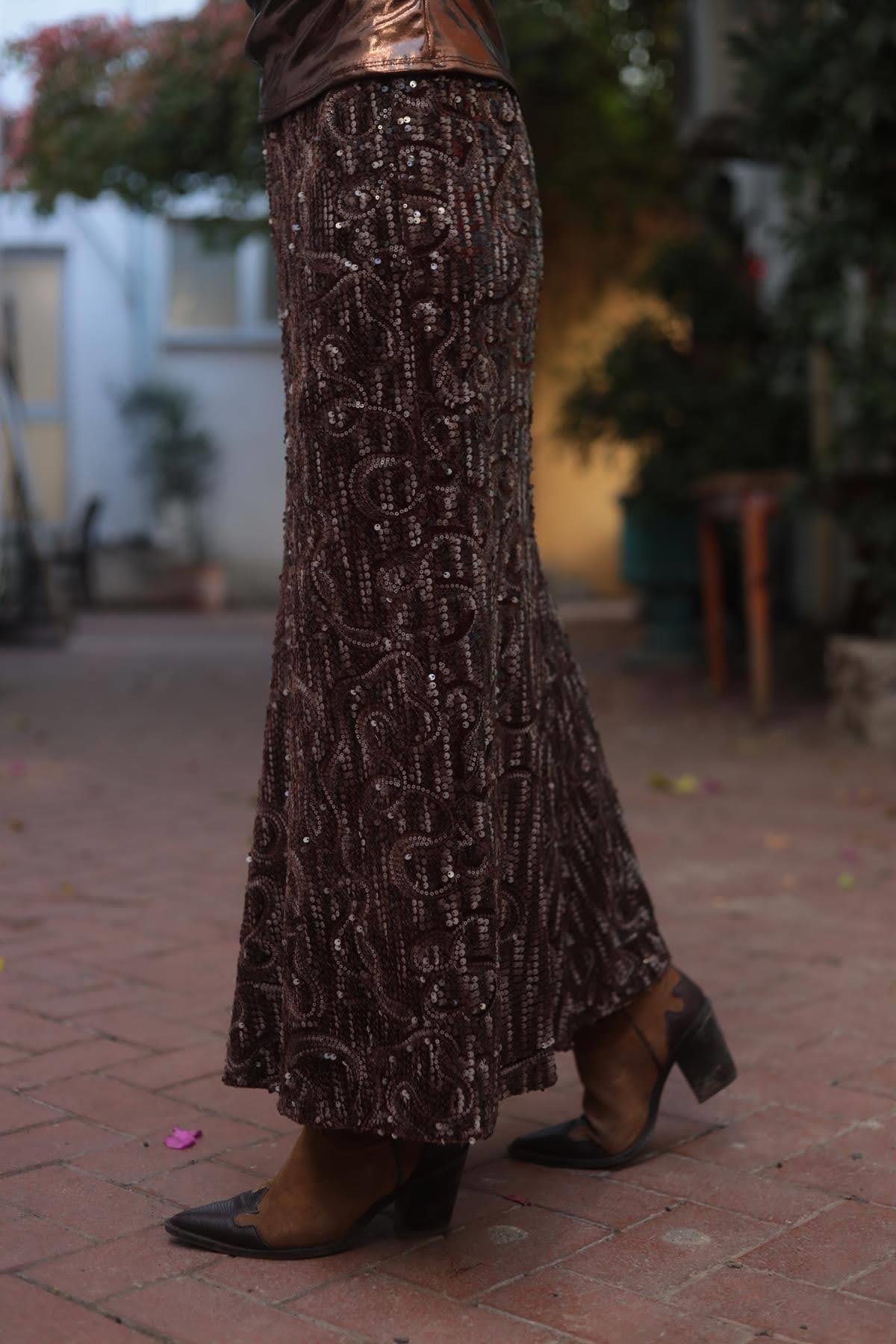 Kahverengi Desenli Payet Etek