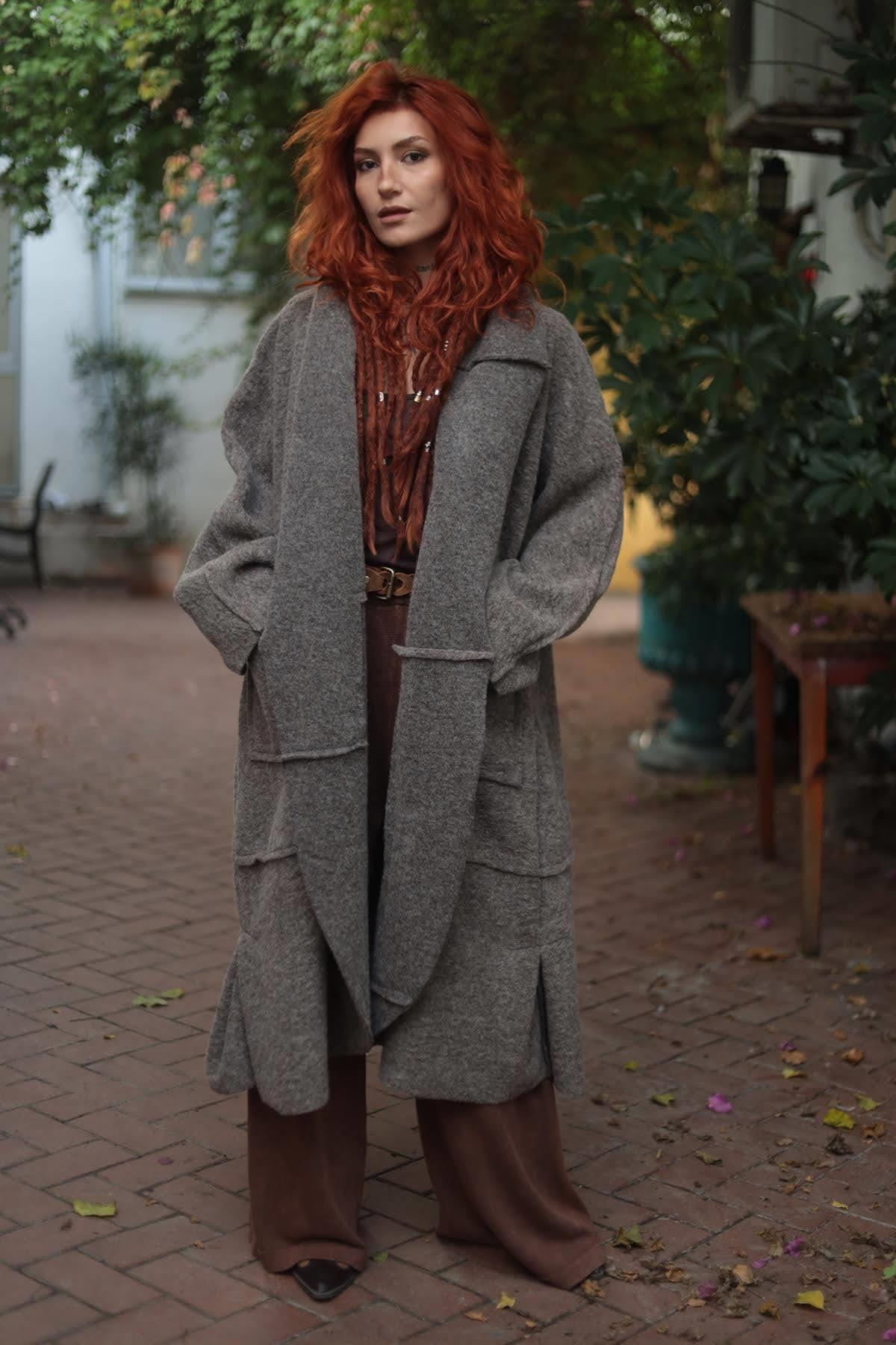 Kahverengi Dikiş Detaylı Şal Yaka Keçe Kaban (KKBN-FAL-005-YUN-KA1-STD)
