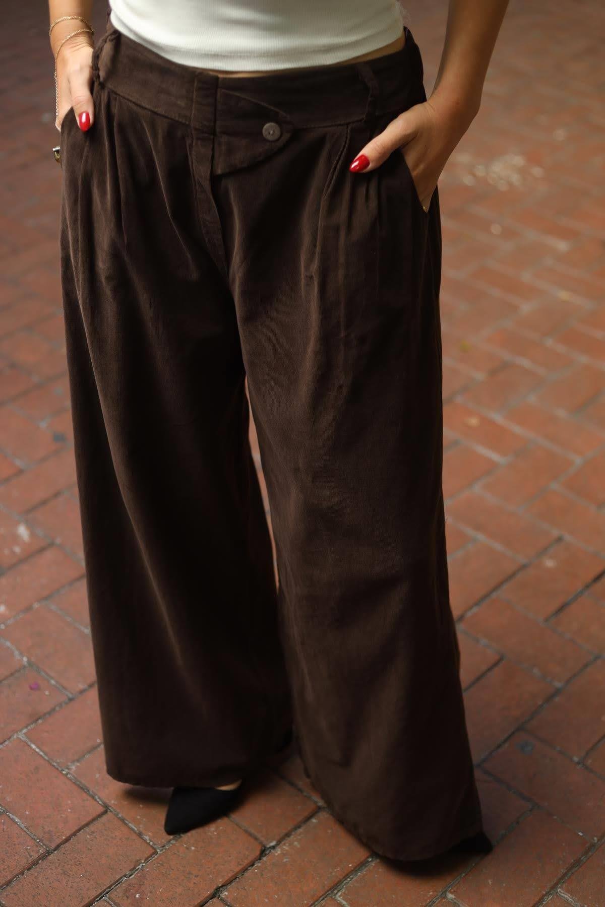 Kahverengi Düğme Detaylı Kadife Pantolon
