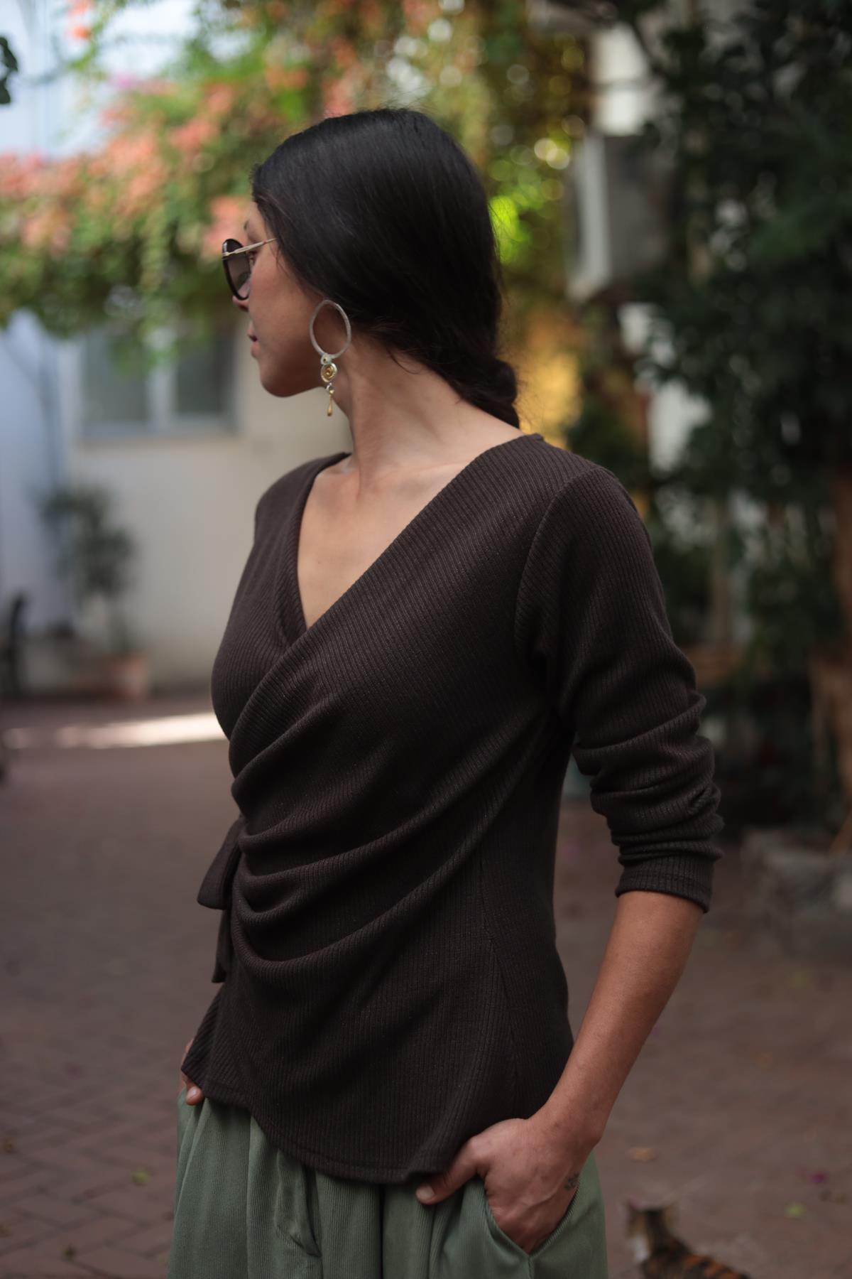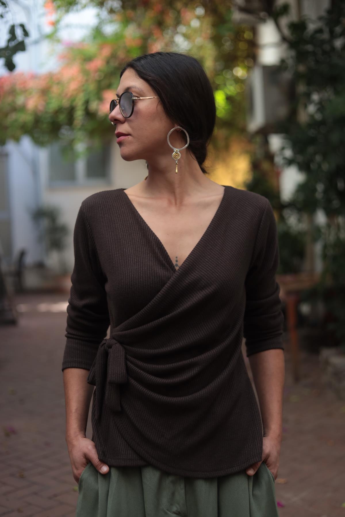Kahverengi Düğüm Detaylı Kruvaze Bluz
