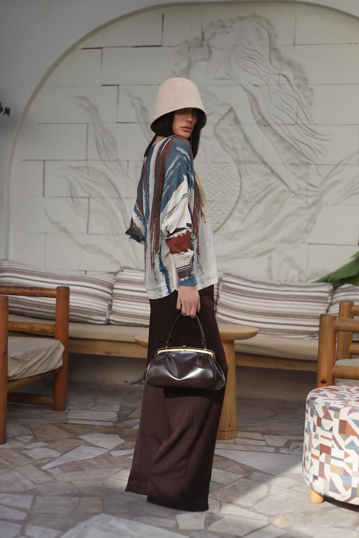 Kahverengi Gizli Düğmeli Palazzo Pantolon