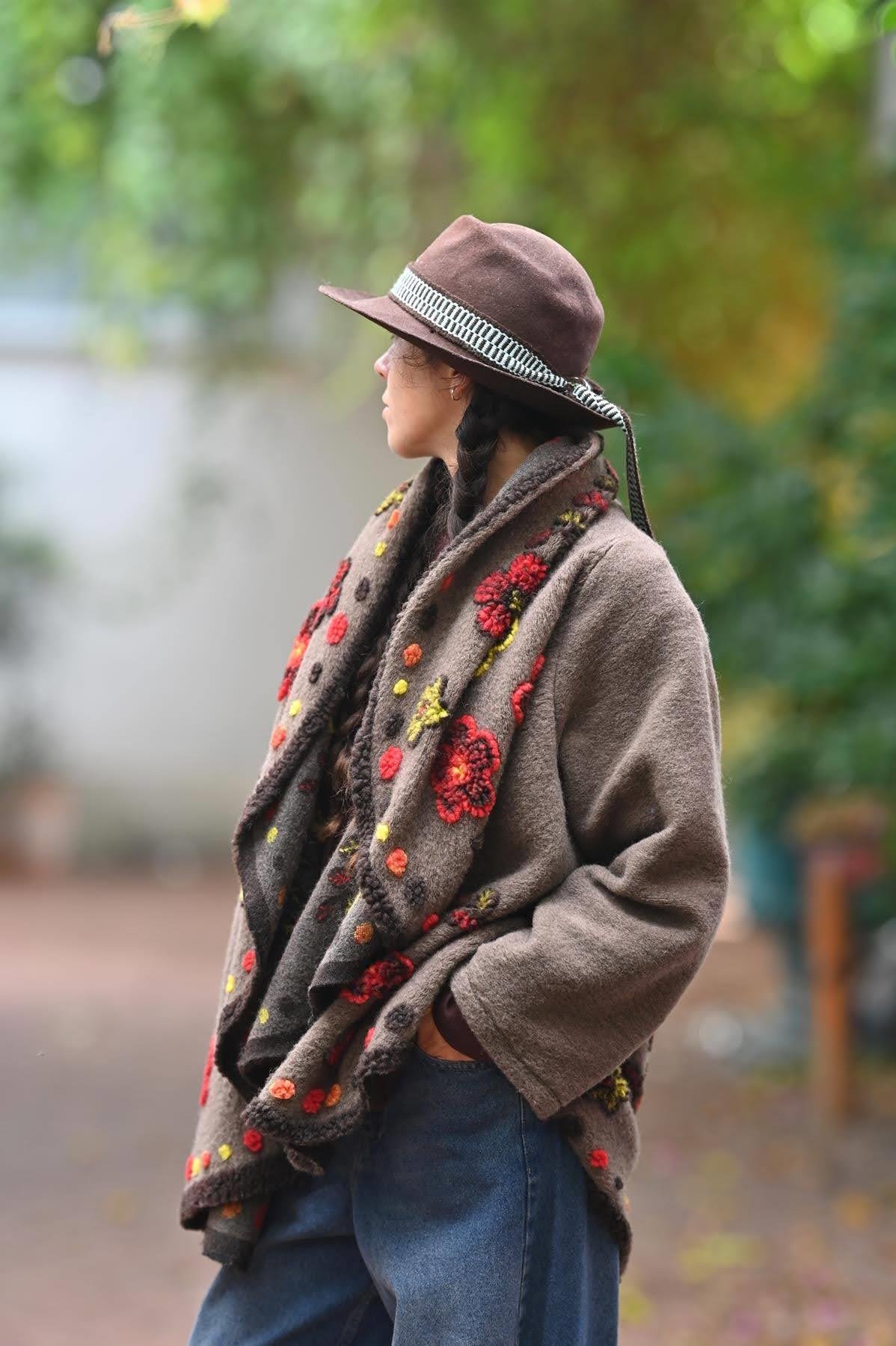 Kahverengi Şal Yaka Çiçek Desenli Keçe Ceket