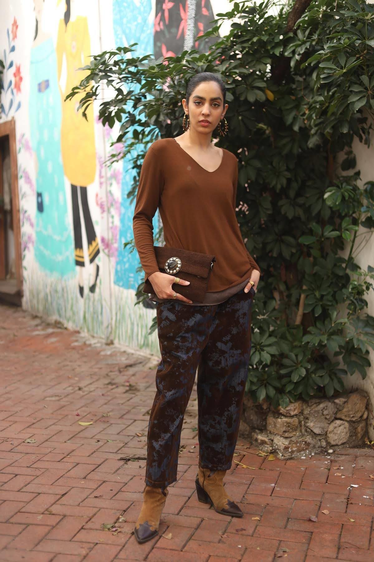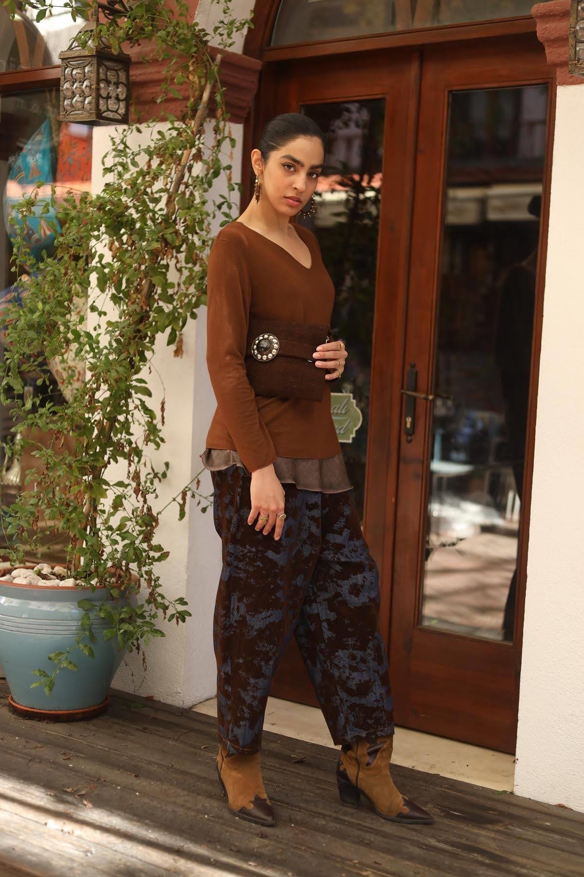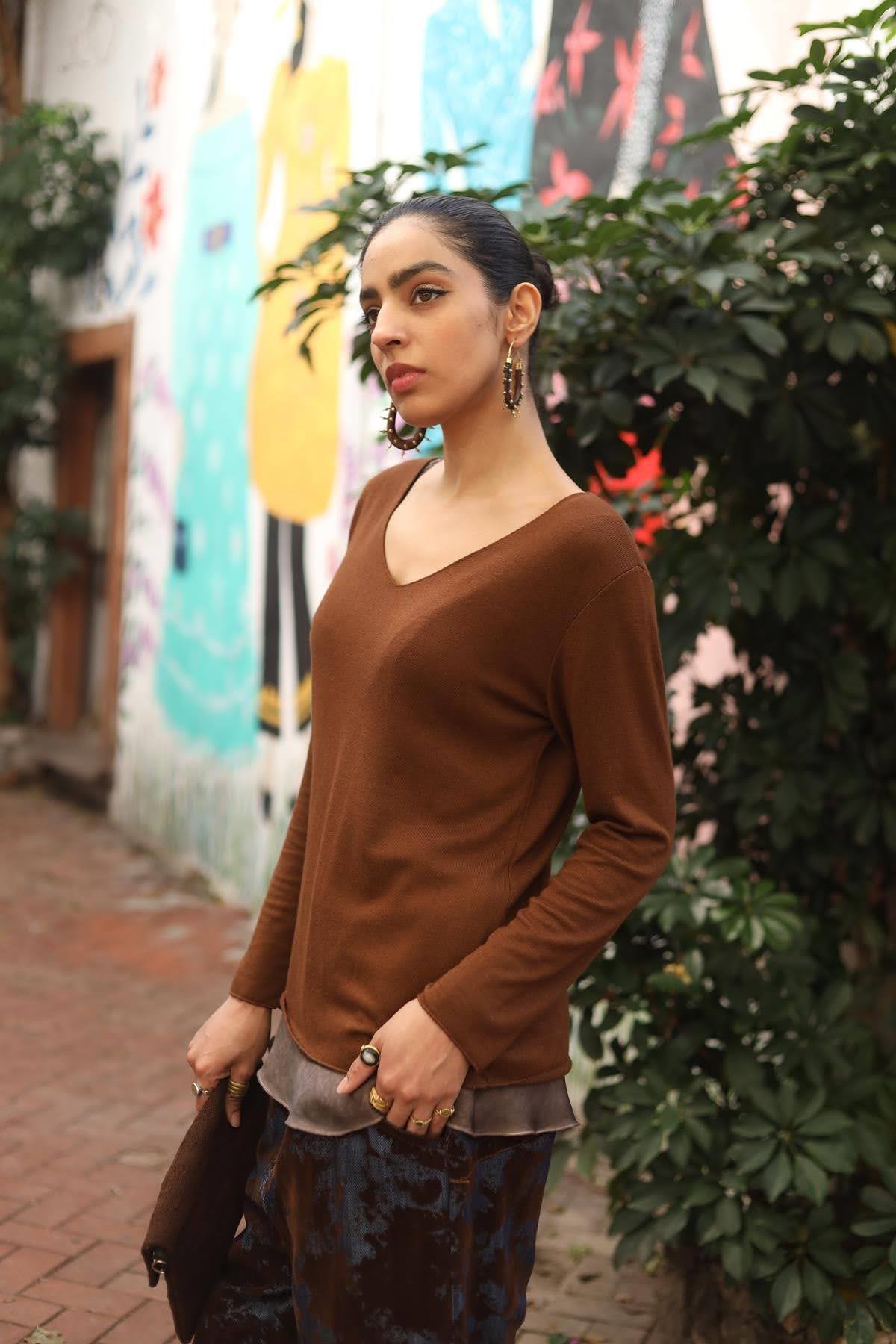 Kahverengi Yumuşak Doku V Yaka Bluz