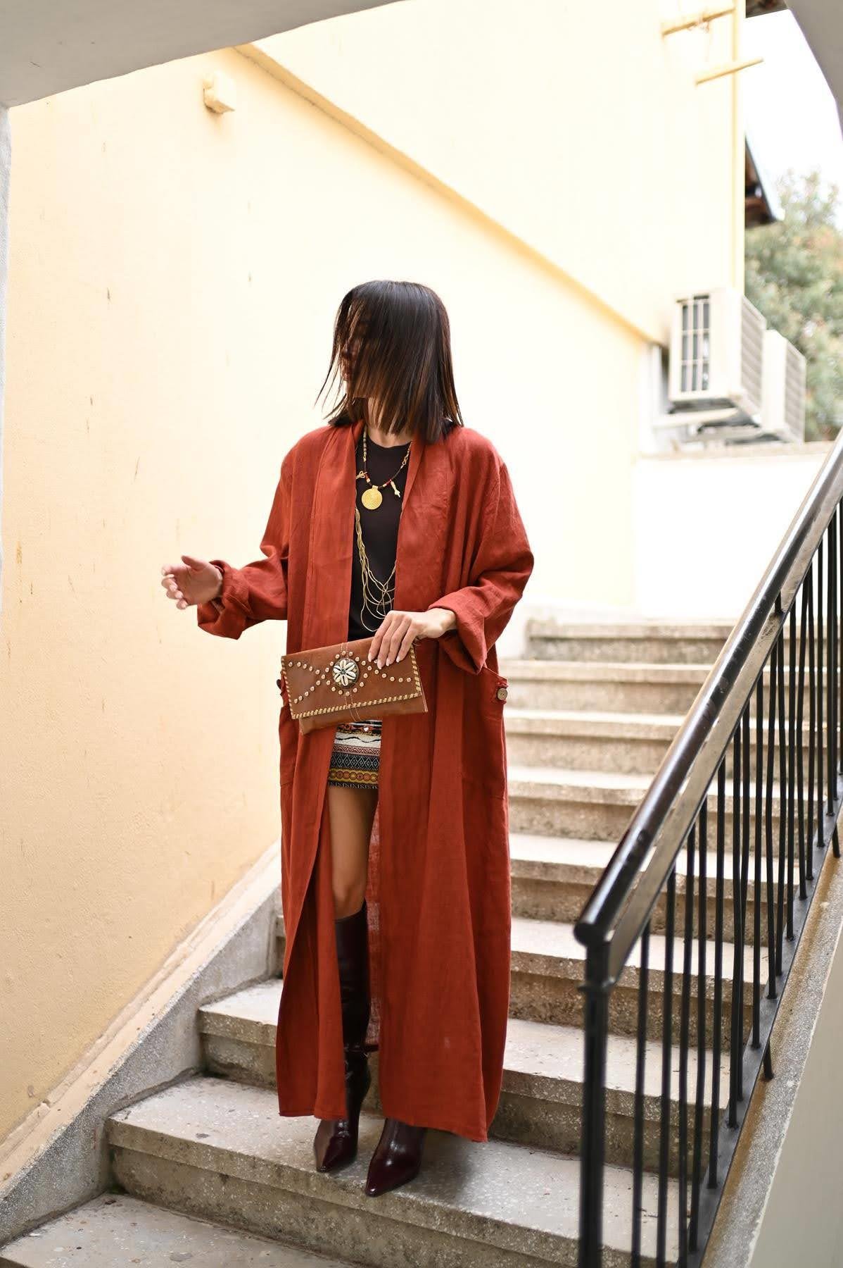 Kiremit Rengi Cebi Püsküllü Düğmeli Keten Kaftan (KKFN-FAL-019-KTN-KK-STD)